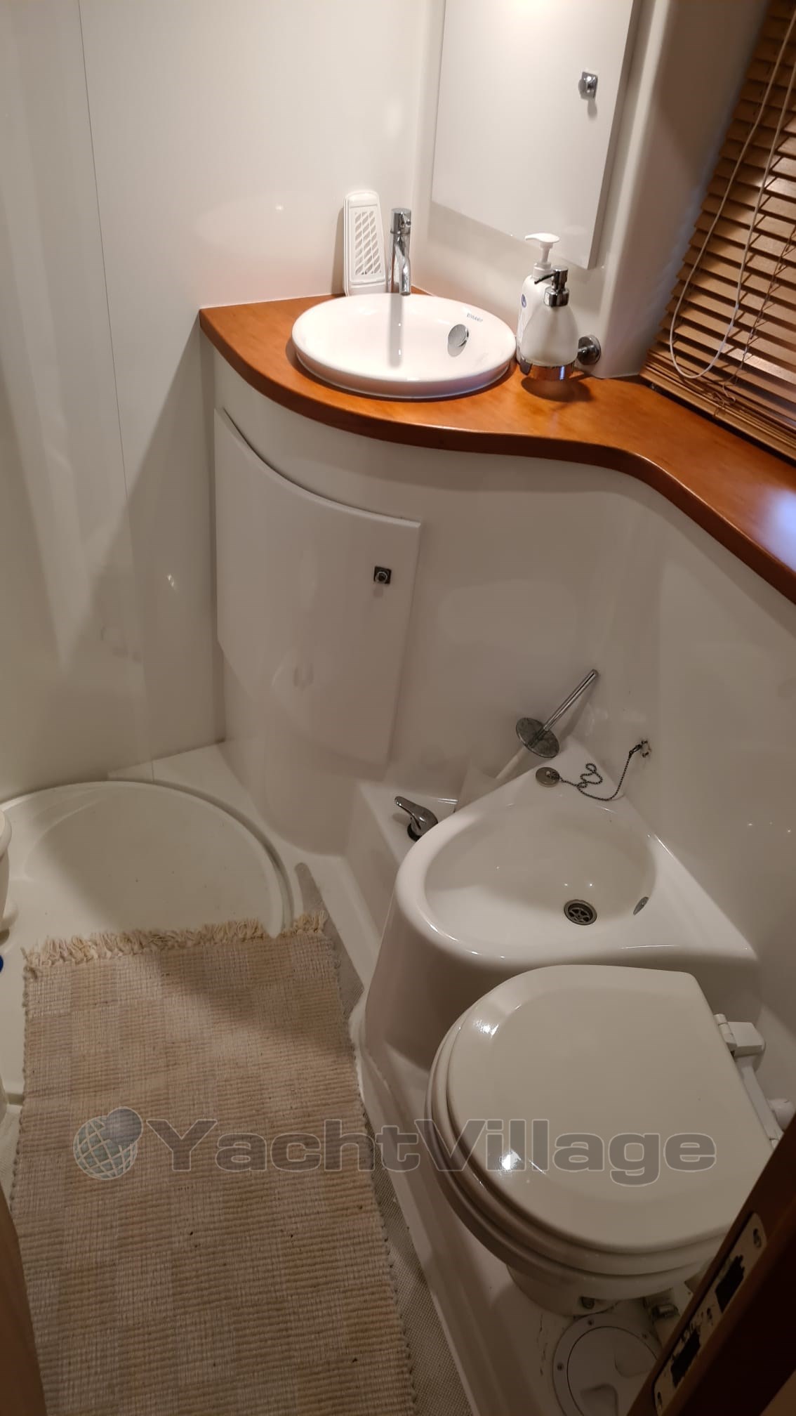 1 Eignerkabine im Bug mit großem eigenem Bad 1 Doppelkabine mit flachen Betten 1 Badezimmer 1 Küche