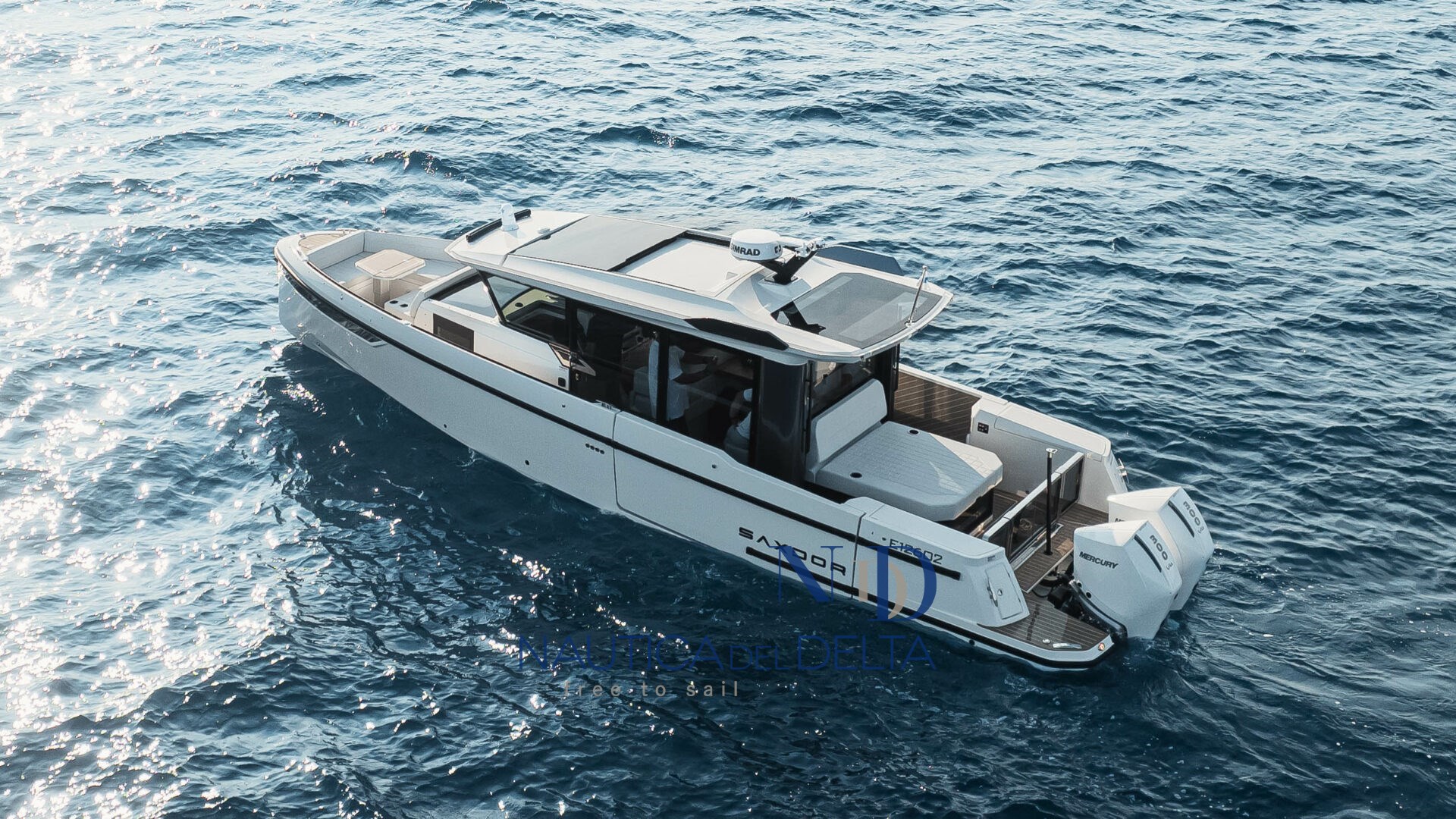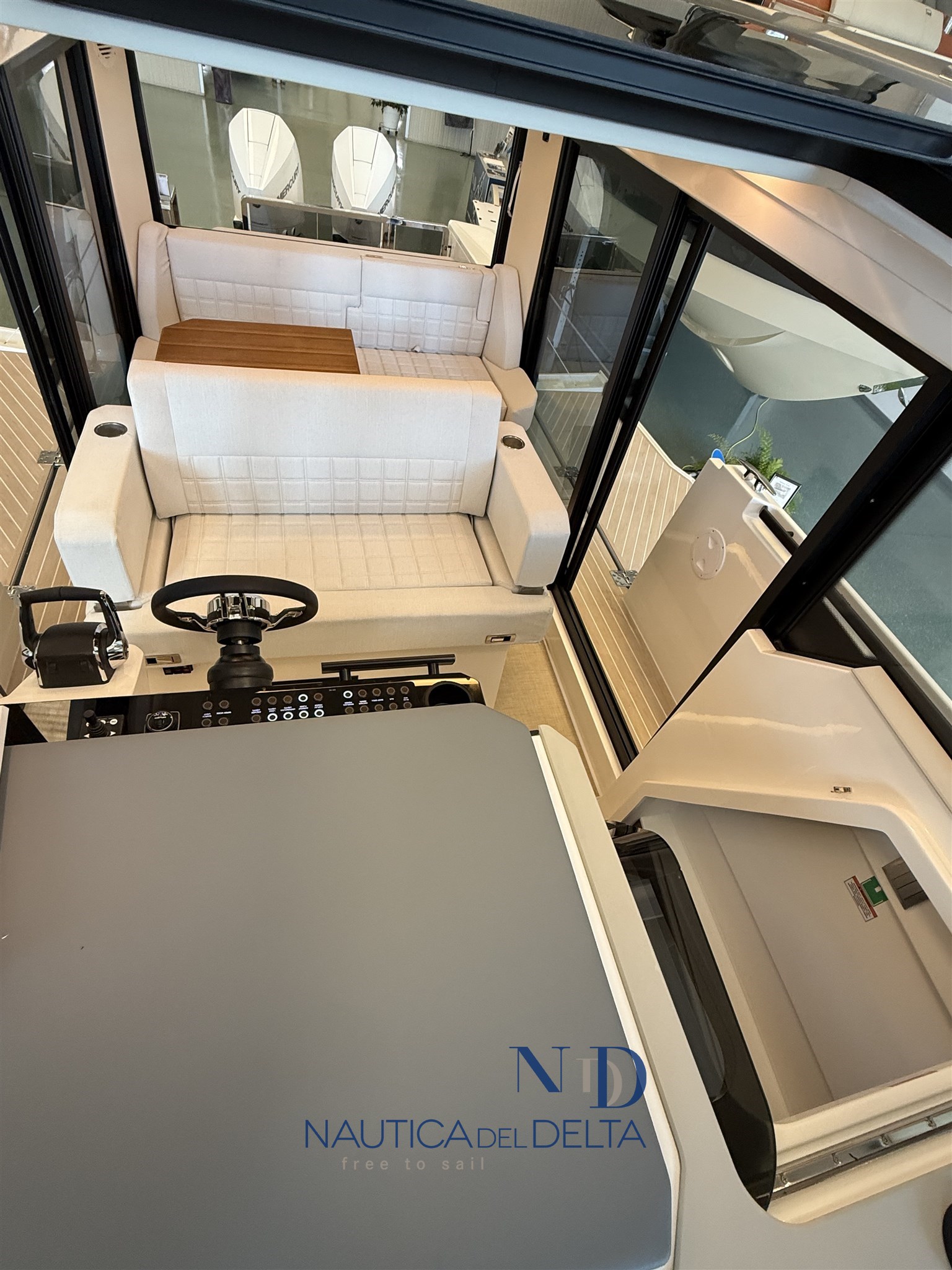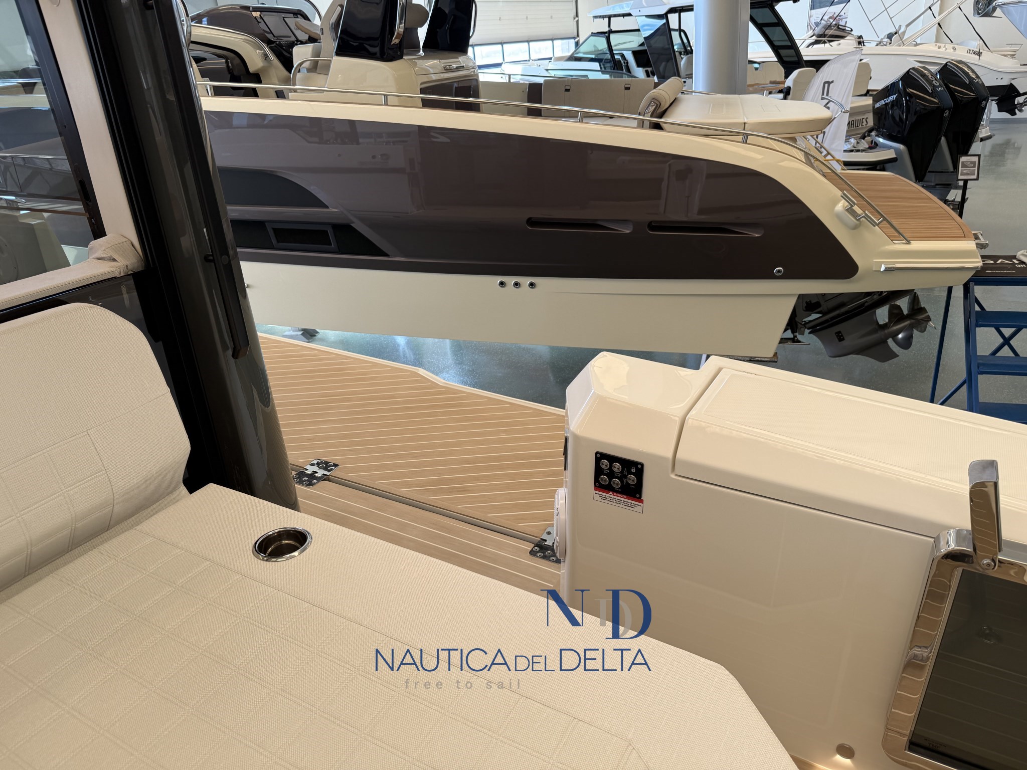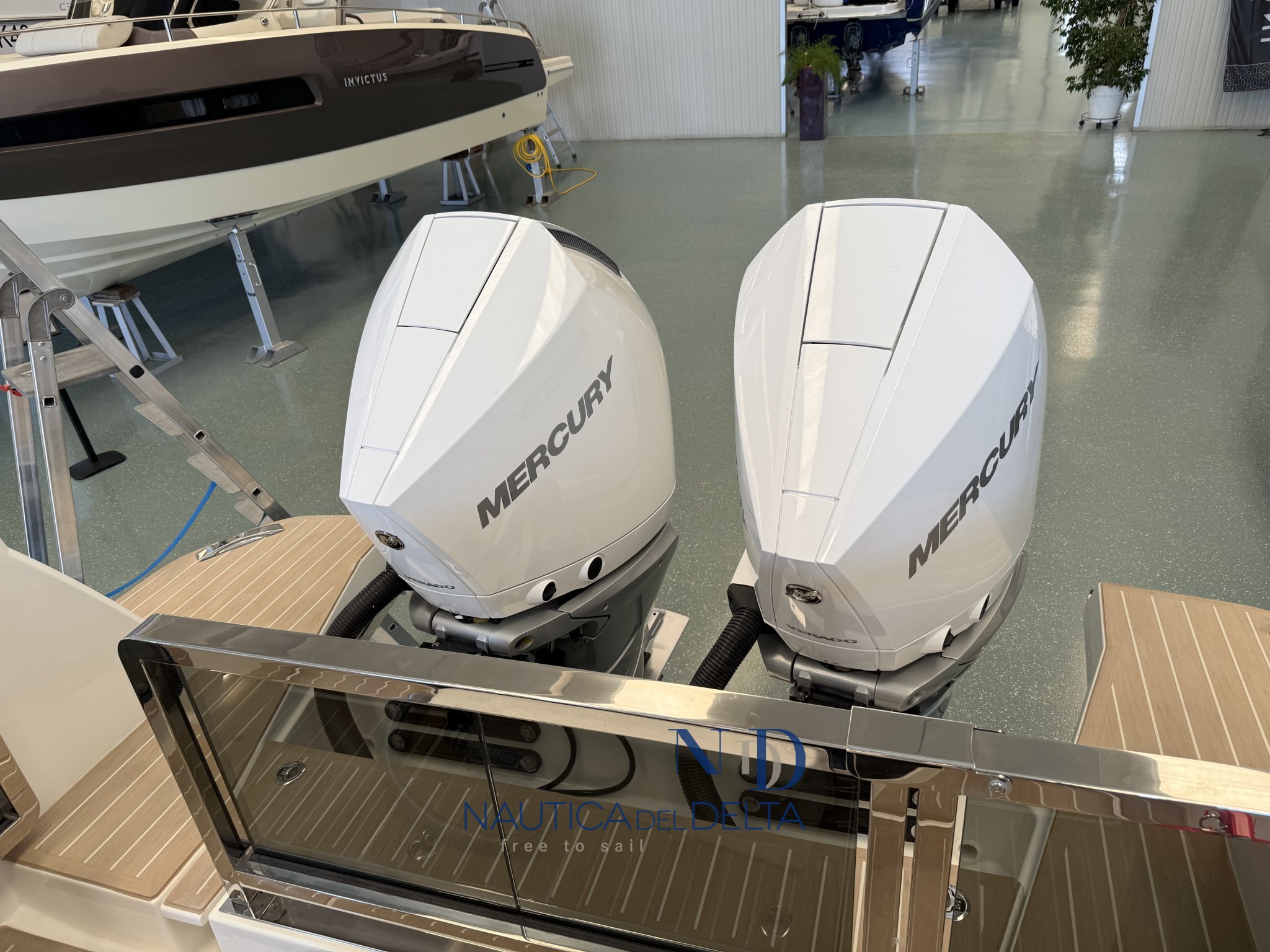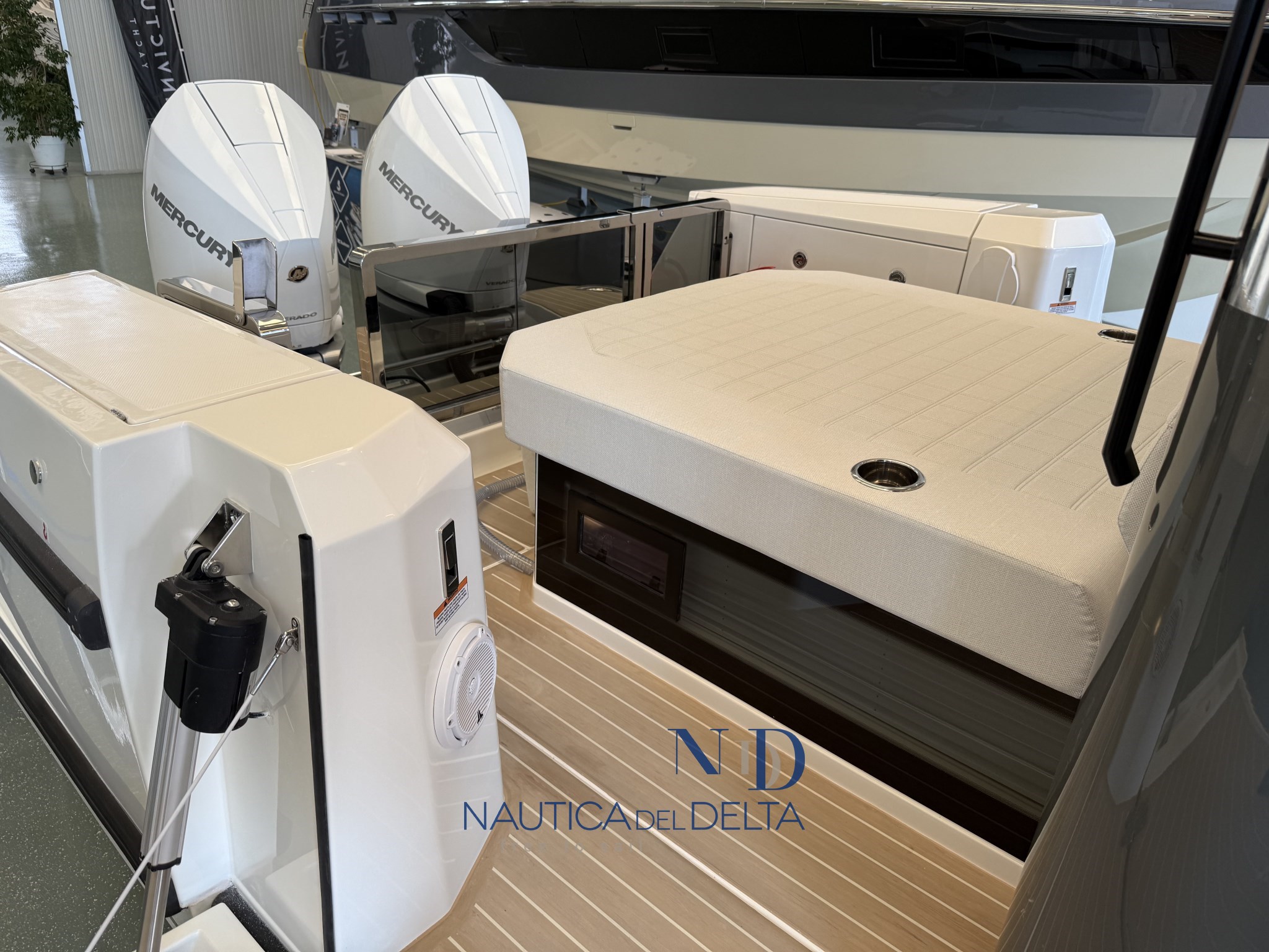 Boot voll optional konfiguriert: weiße 2x300 Mercury-Motoren, Klimaanlage mit Wechselrichter und Lithiumbatterien, Flexiteek, Bugstrahlruder, elektrisches Schiebedach, Achterkabinenbeschlag, automatische Zipwake-Klappen, Achtergrill, Kühlschrank, Navigationspaket, Hecktore.