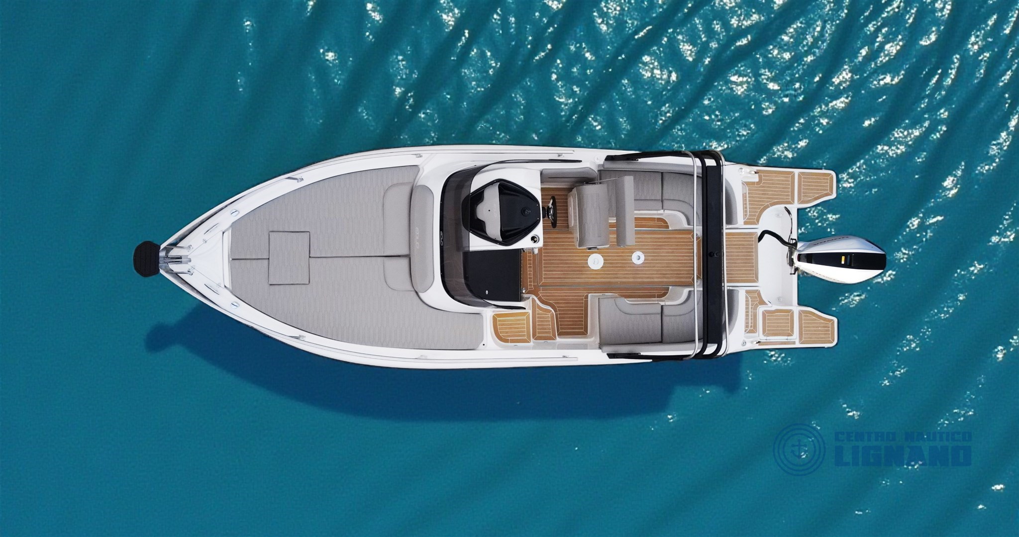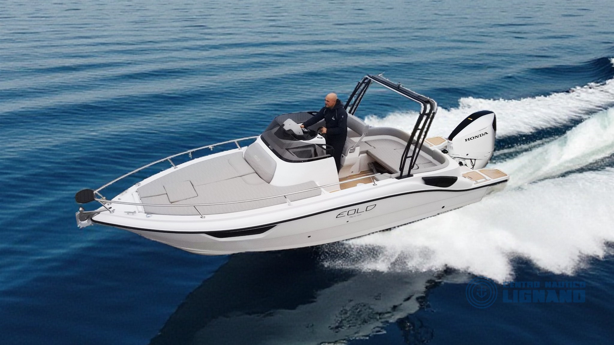 Der brandneue Eolo Marine 7.9EL 2026 ist bereit zur Auslieferung und ist in unserem Hauptsitz Centro Nautico Lignano sichtbar, komplett mit dem neuen Honda Marine BF250AK1 2026 Total White Motor. Eine gewinnende Kombination mit hoher ästhetischer Wirkung.