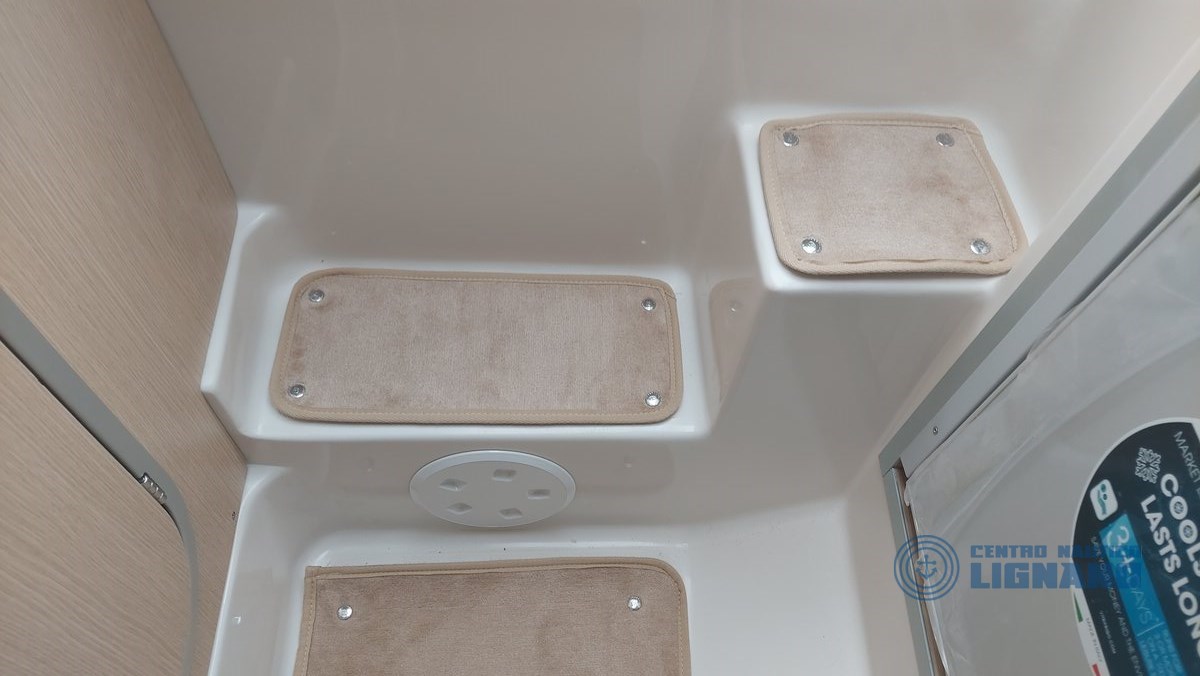 Zu den enthaltenen Zubehörteilen gehören: weißer Rumpf, beige Polster mit Lamborghini-Textur, schwarzer Satin-Edelstahl-Überrollbügel mit Markise, schwarz lackierte Konsole, synthetisches Teakholz-Cockpit und Treppen, elektrische Winde mit Anker und Kette, Schwarzwassersystem und elektrische Marinetoilette, Luke, Bullauge, Plexiglasfenster, Kühlschrank, Bug-Sonnendeck, Buggeländer, Bugwalze, Poller, Zughaken, Tisch mit Fuß, hintere Sonnenbadeverlängerung, Schwimmleiter aus Edelstahl, Kraftstoffsystem 270 lt, Wasser- und Duschsystem 67 LT, elektrisches System mit Hupe, Navigationslichtern, Leuchtleuchten, 360°-Licht, 12-V-Steckdose, Bilgenpumpe, Batteriediverter, Heckplattformen mit synthetischer Teakbeschichtung.