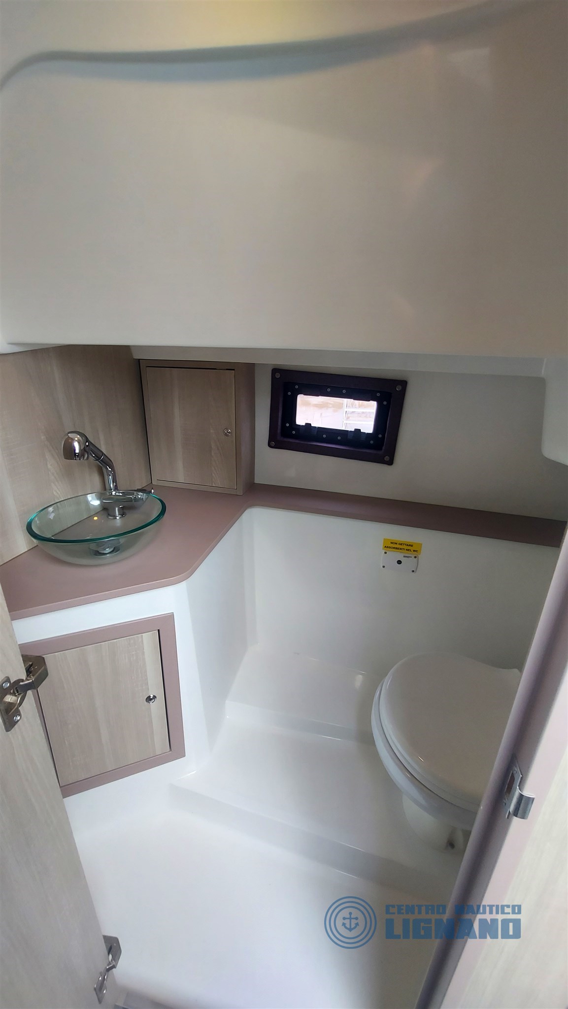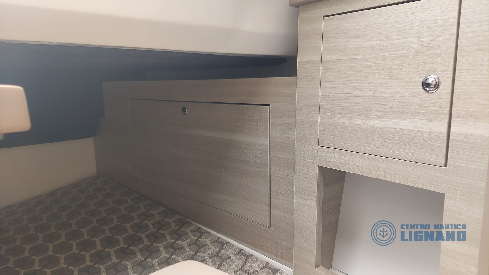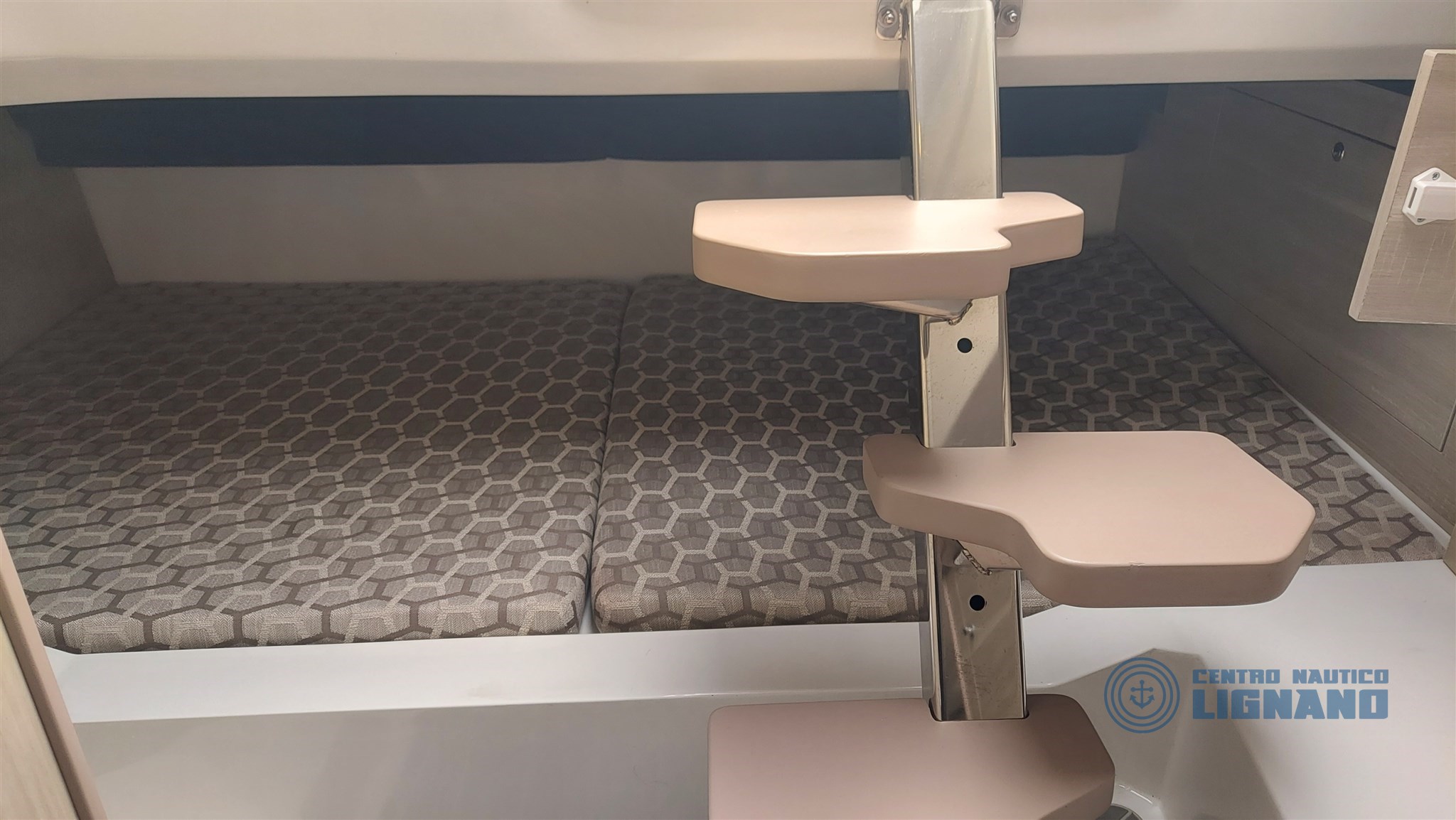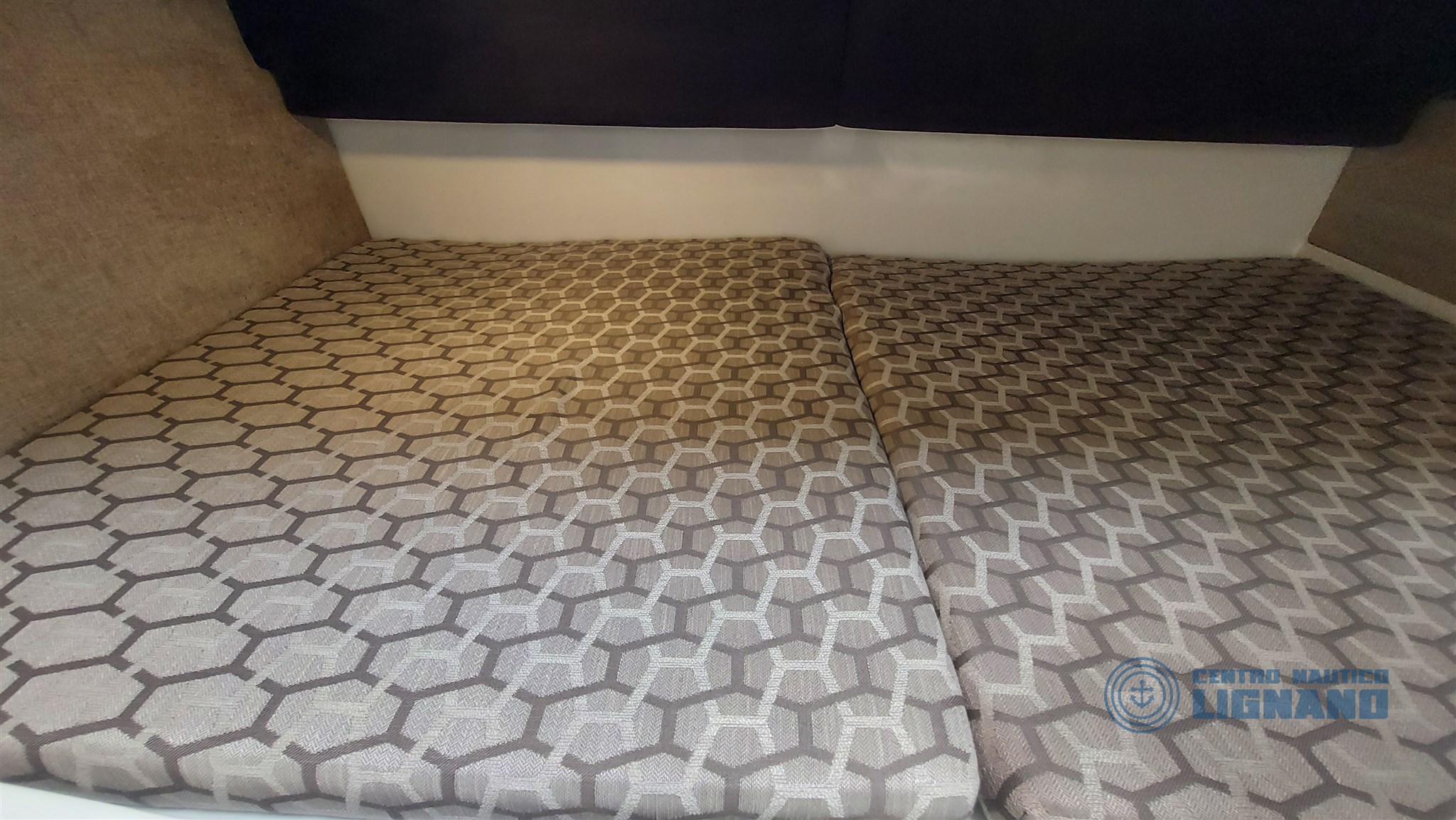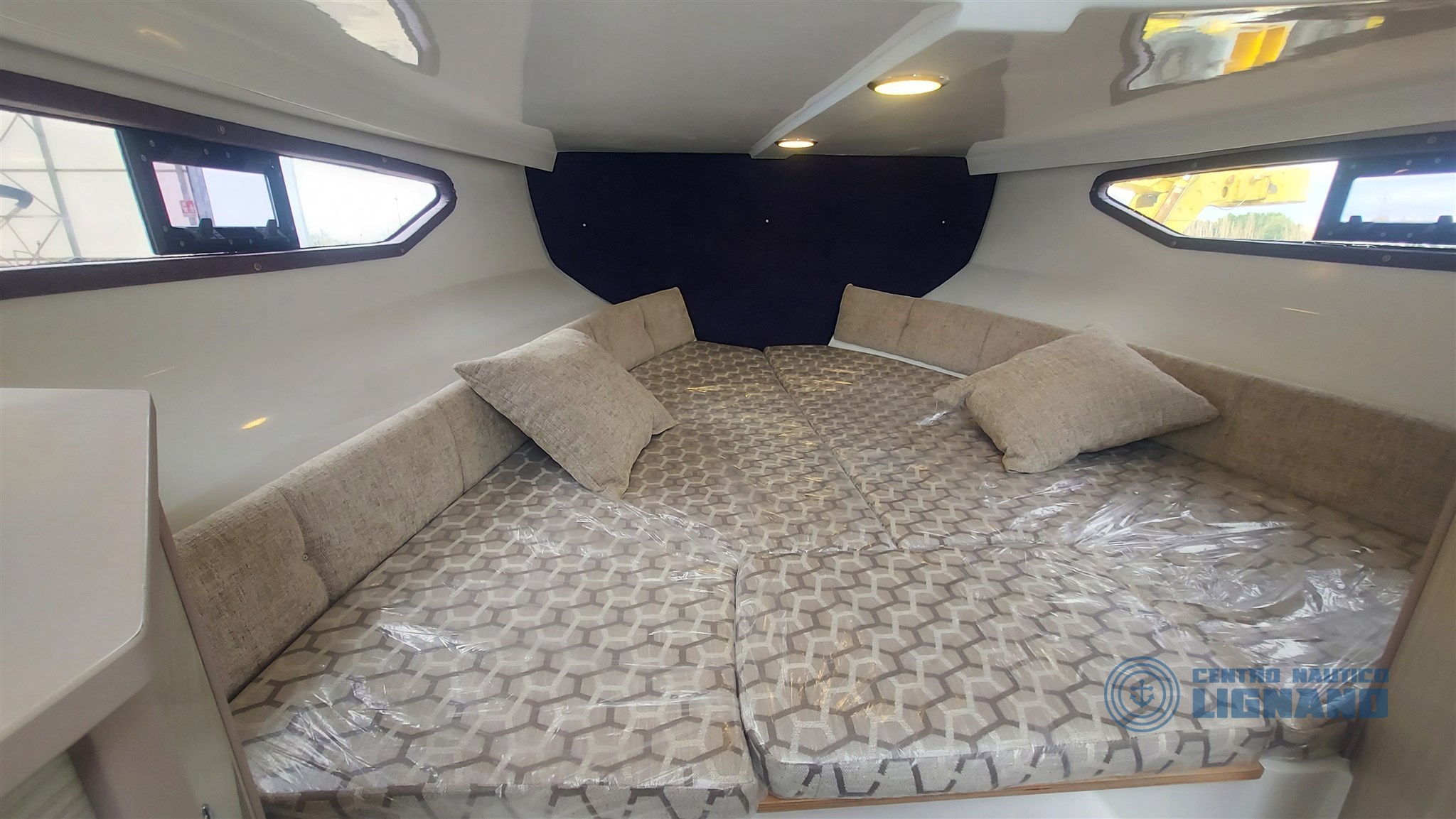 INNEN: Innenpolster noch mit Zellophan, Doppelbett mit Bug (ebenfalls mit Zellophan), nr. 2 Kissen, perfekte komplette Möbel, kratzfeste Stützfläche, Sonnenjalousien, öffnende Bullaugen, Bugbett-Verlängerungsbrett mit Kissen, Innenboden mit synthetischem Teakholz, interne 12V-Steckdose, zentrale Bilgenpumpe, Heckbett mit perfekten Matratzen, Versorgungspaneel mit Thermomaterial