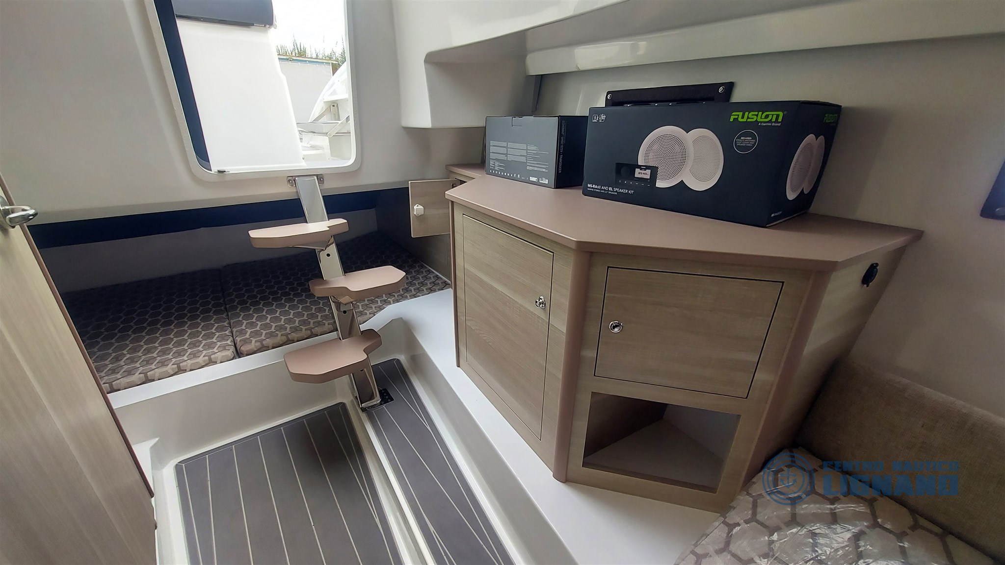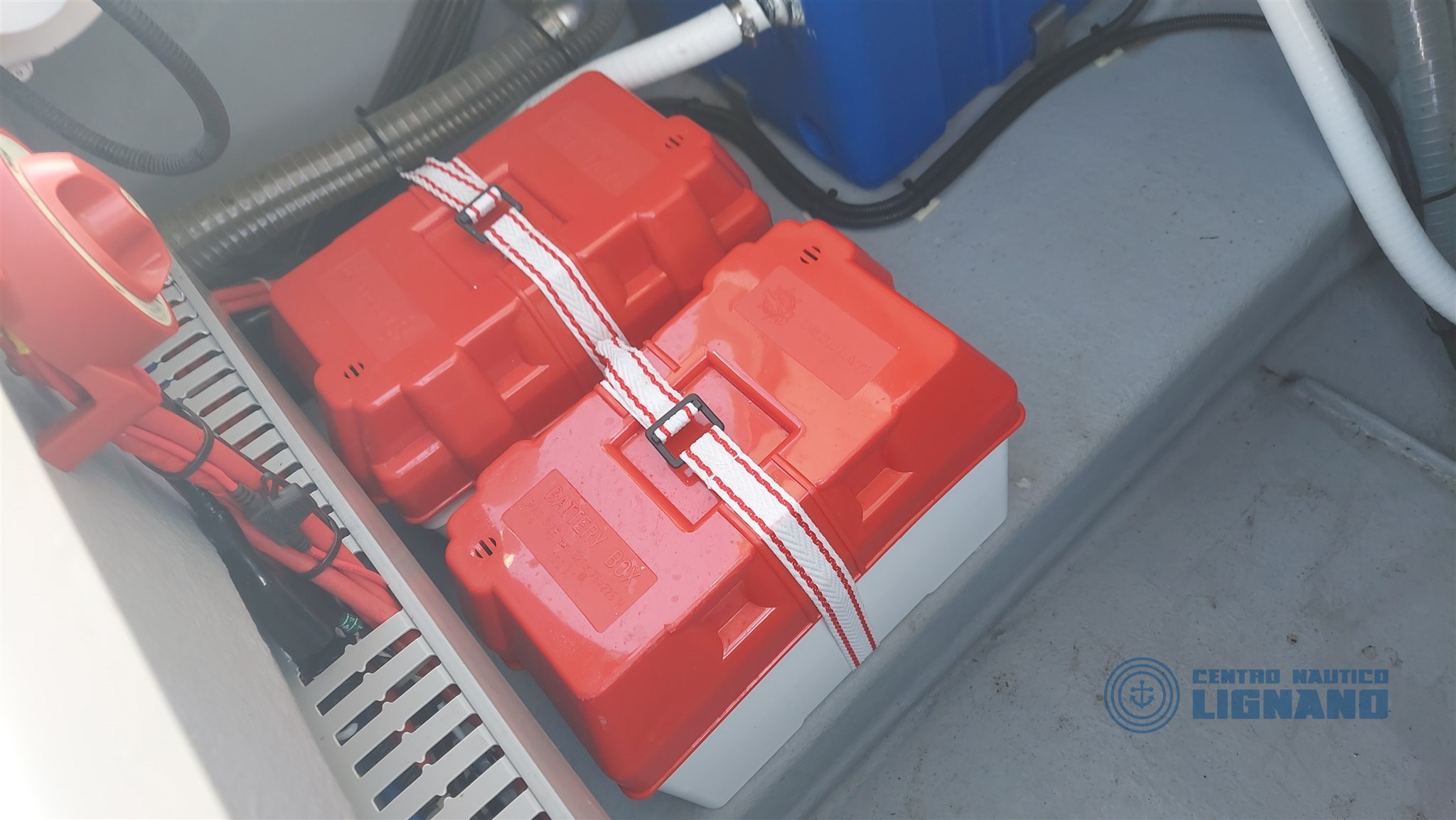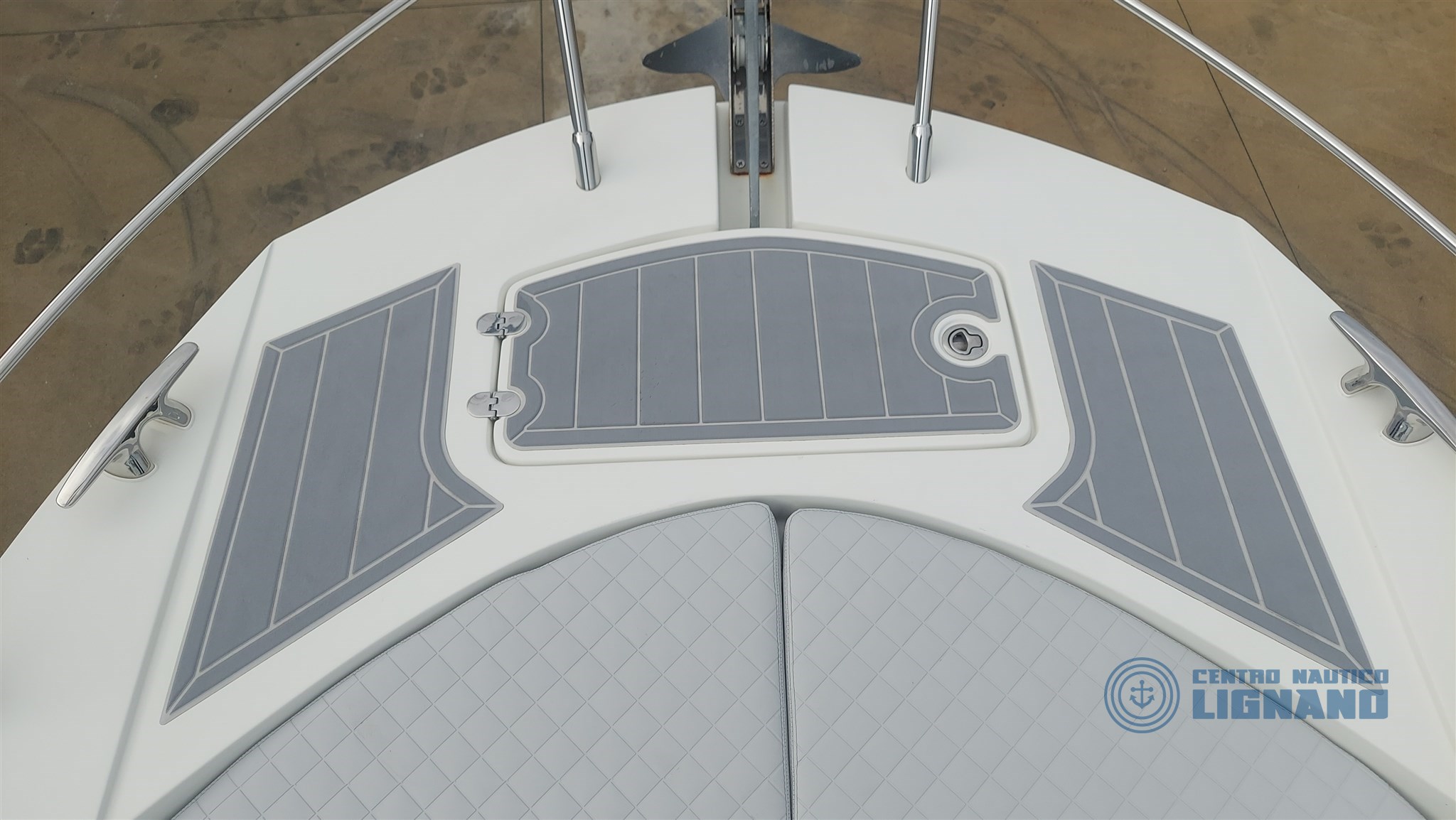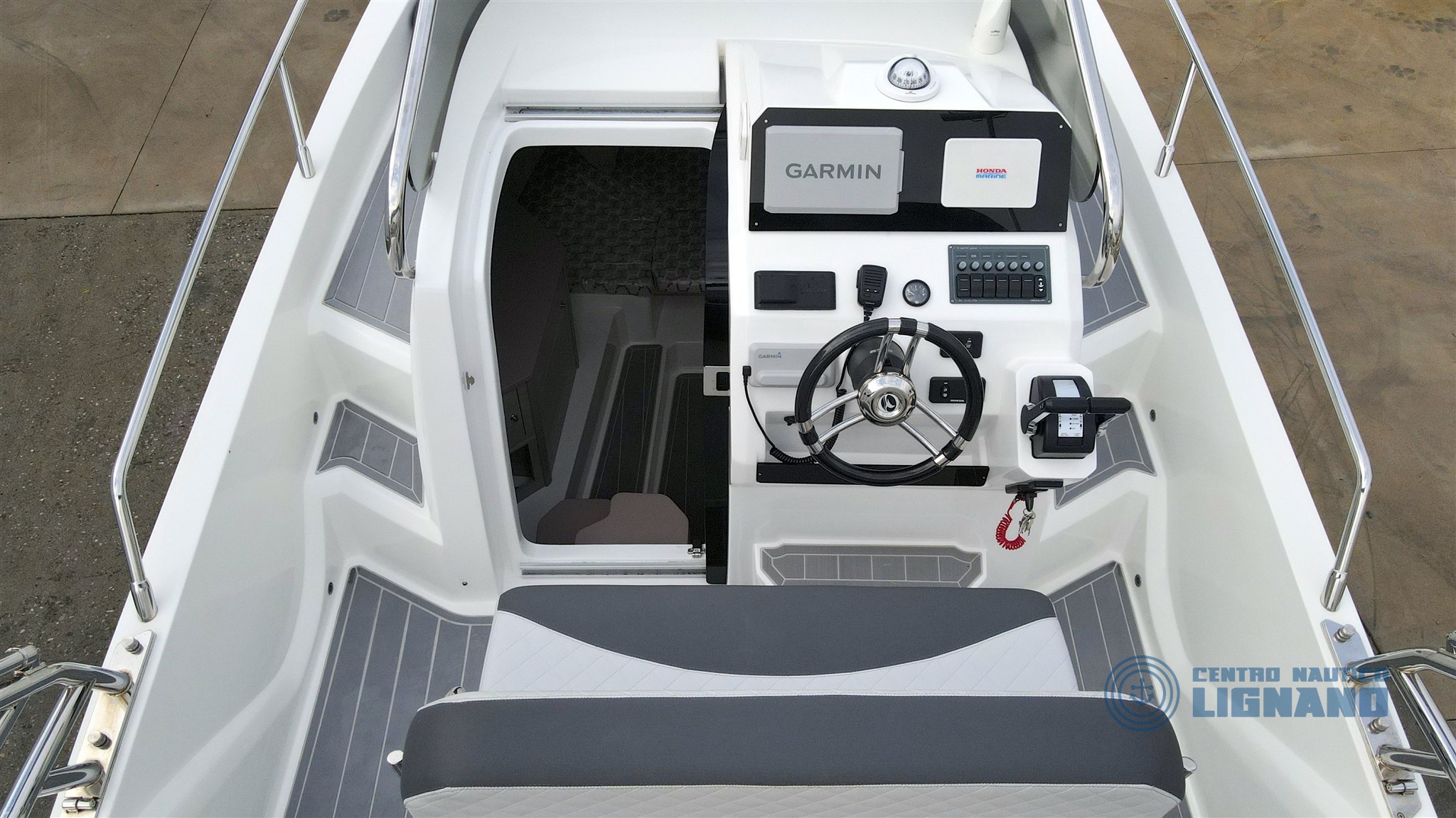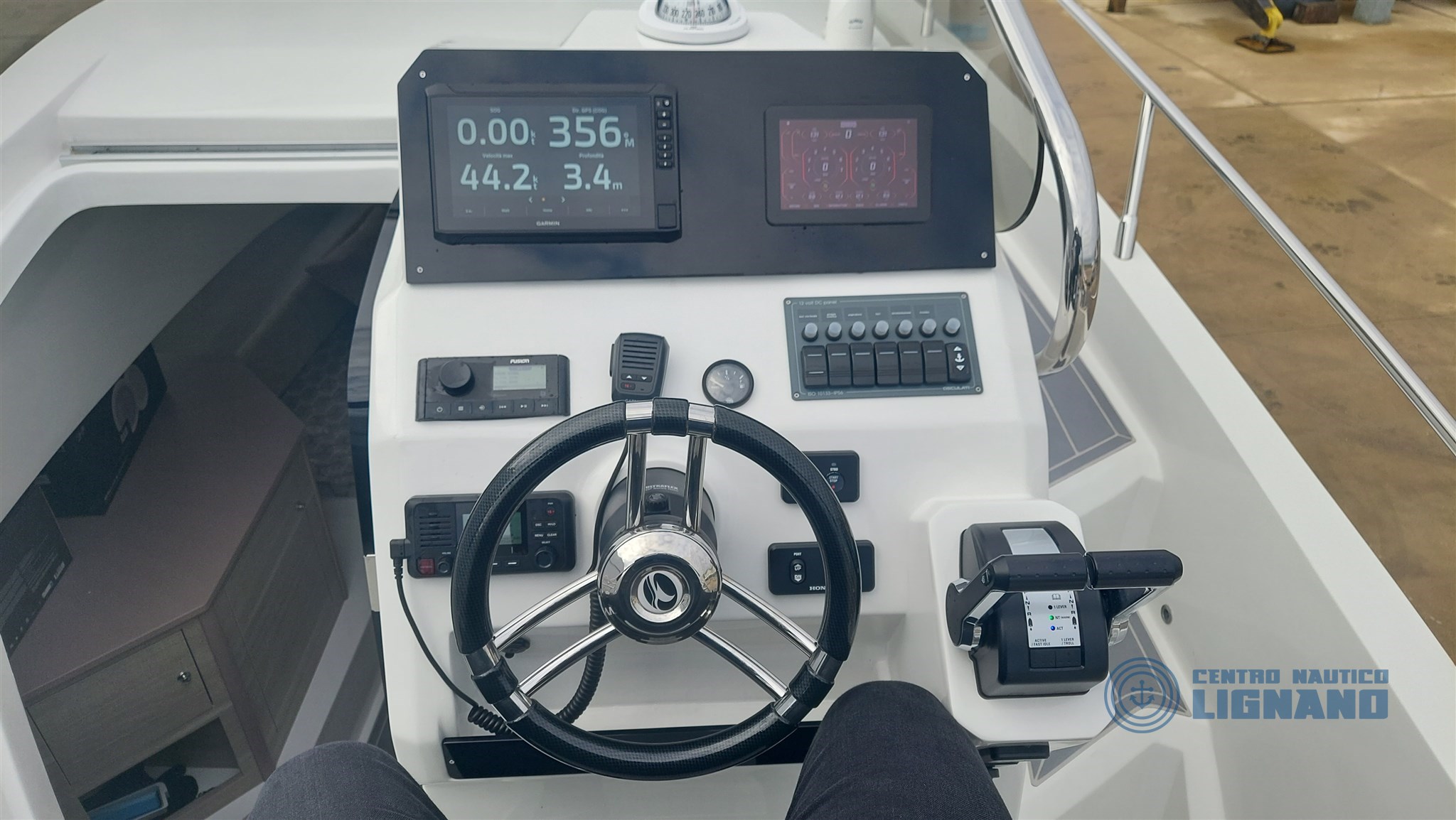 INSTRUMENTIERUNG: Garmin VHF-Funkgerät mit kompakter Antenne, Garmin Echomap UHD 92 HP kartografisches GPS-System, Adriatisch-Karte, hochauflösender Heckwandler, Fusion-Stereoanlage mit 4 Lautsprechern (2 RGB im Cockpit und 2 weiße im Bug), doppeltes 12V-Batteriesystem mit wasserdichten Kassetten, Kraftstoffanzeige, elektronische Binnacle-Steuerung, 7" Honda Marine MFD-Monitor, Elektronische Steuerung, Einzel- oder Doppelzündung, elektrische Winde mit Bedienung im Bedienpult und auch am Bug, Anker und Kette, Bilgelüfter, Kompass,