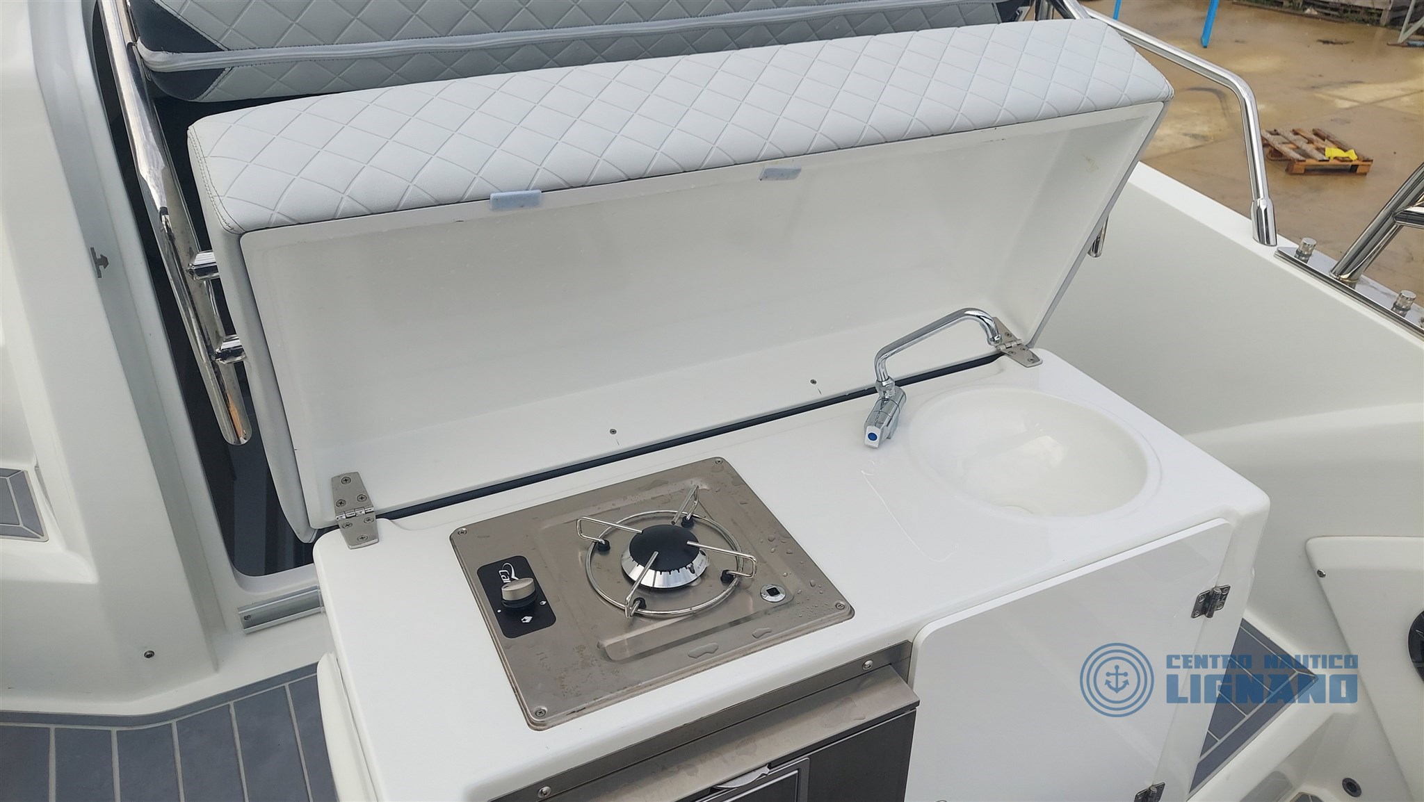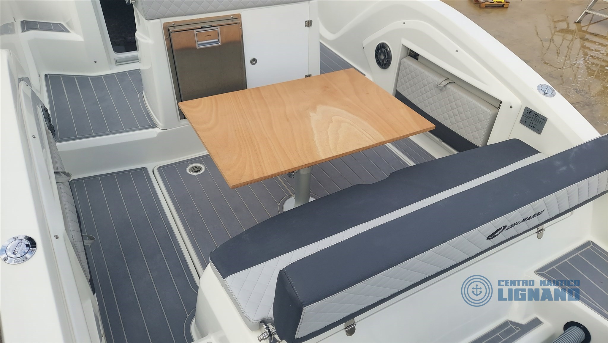 Außenseite: Abdeckungen (3 Teile), Edelstahl-Überrollbügel mit Doppelmarkise, Feuchtstange mit Doppelsitzer-Fahrersitz, äußerer Edelstahlkühlschrank mit Gefrierfach, äußeres Waschbecken im Feuchtpark, 1-Brenner-Gasherd (ohne Zylinder), Heckplattformen mit synthetischem Teakholz, weiße Leuchtleuchten, Licht im Überrollbügel, Navigations- und Ankerlichter, Teleskopische Seeleiter mit 4 Sprossen, Edelstahlstangen zum Schutz der Plattformen, zweifarbige graue Polster, weißer Rumpf, kompletter Außenboden aus grauem synthetischem Teakholz mit hellgrauer Verbindung, Bänke im klappbaren Cockpit, Außentisch mit Aluminiumstütze.