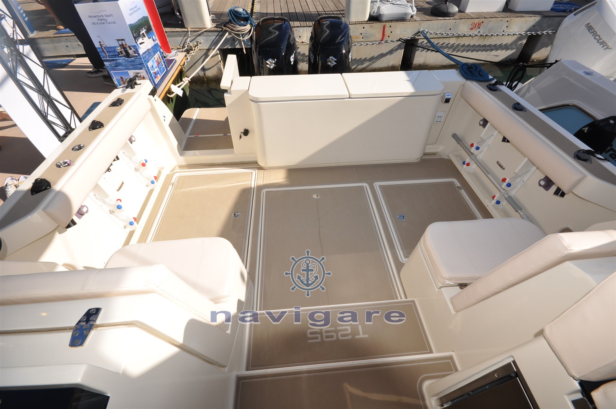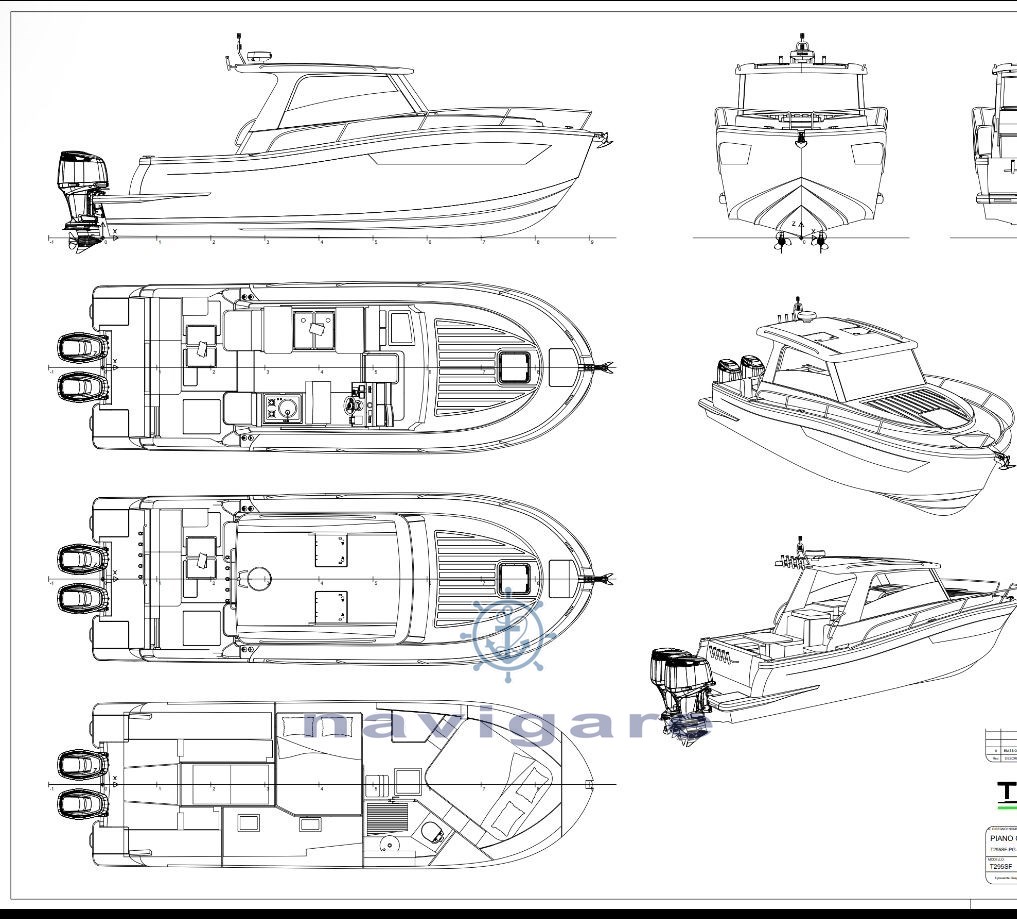 A hardtop protects the galley/dinette area and the console, which looks towards the bow where a large sundeck defines the bow as the relaxation area for the fisherman's family. The classic Tuccoli hull brings this boat up to 43 knots thrust from 600 hp, in single or twin-engine version, exclusively outboard. For cruising speed, however, this hull is around 25 knots.