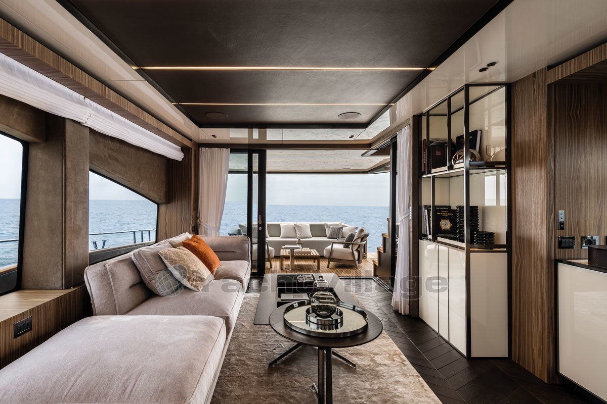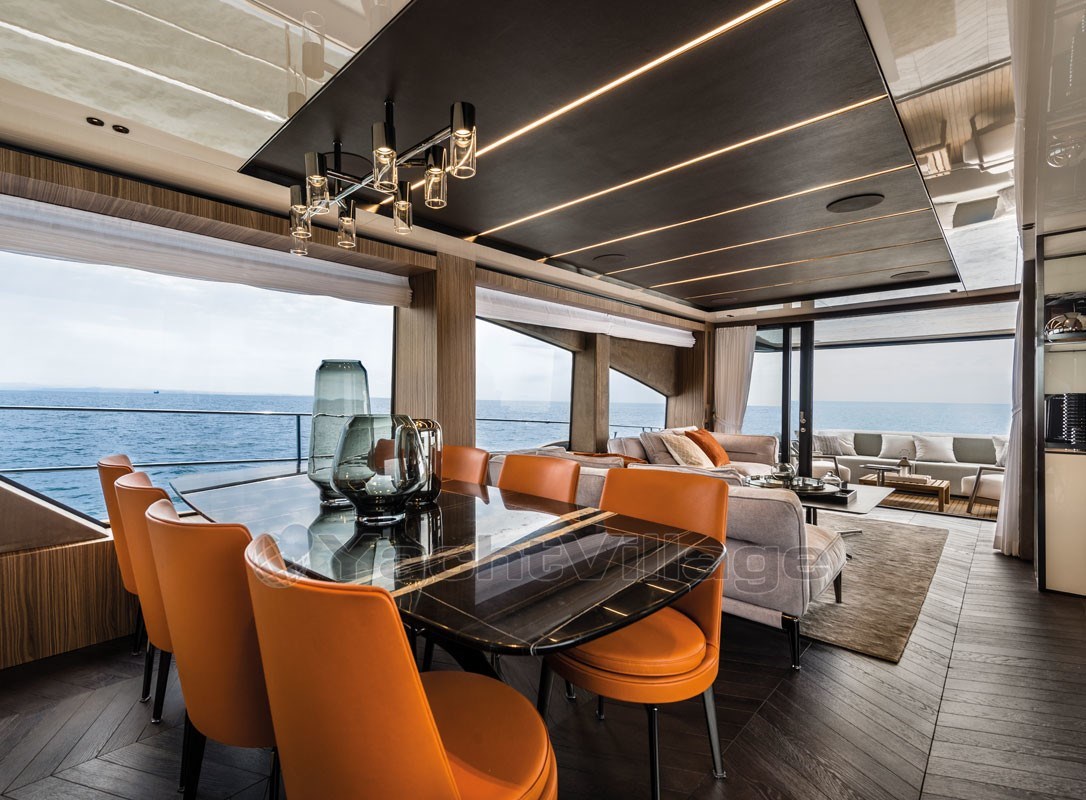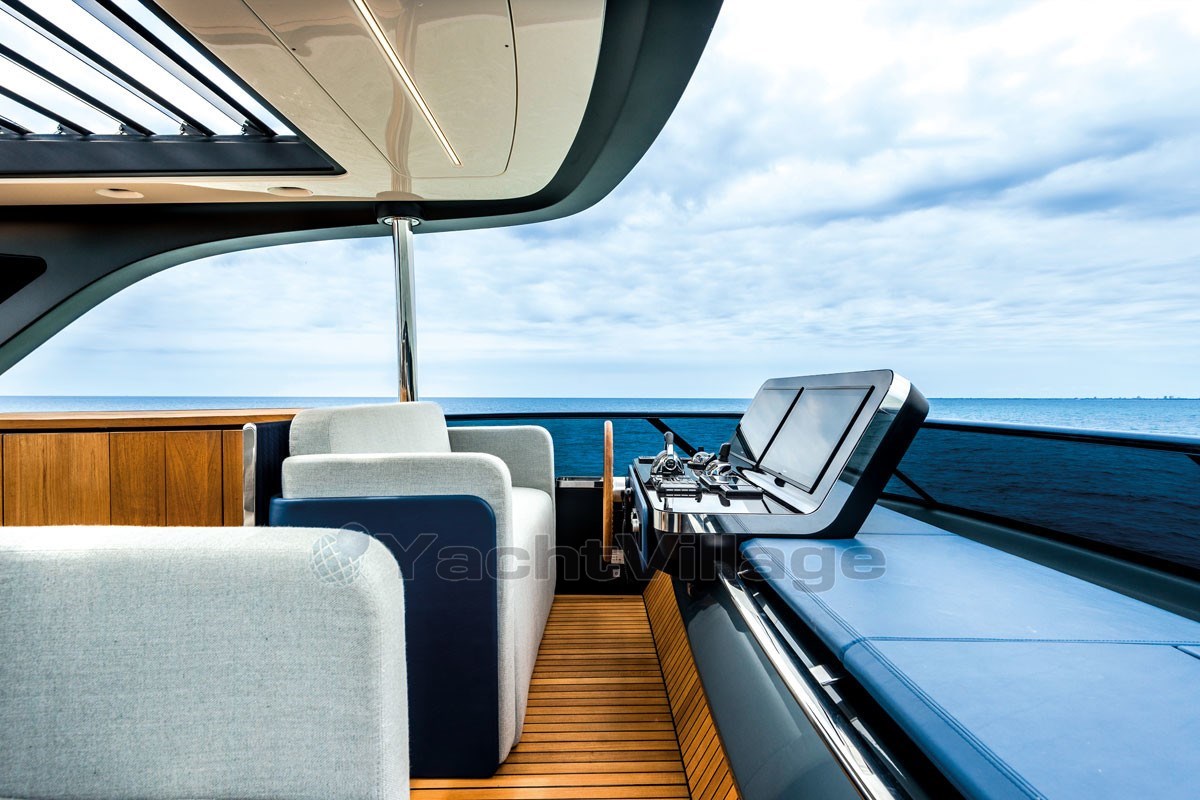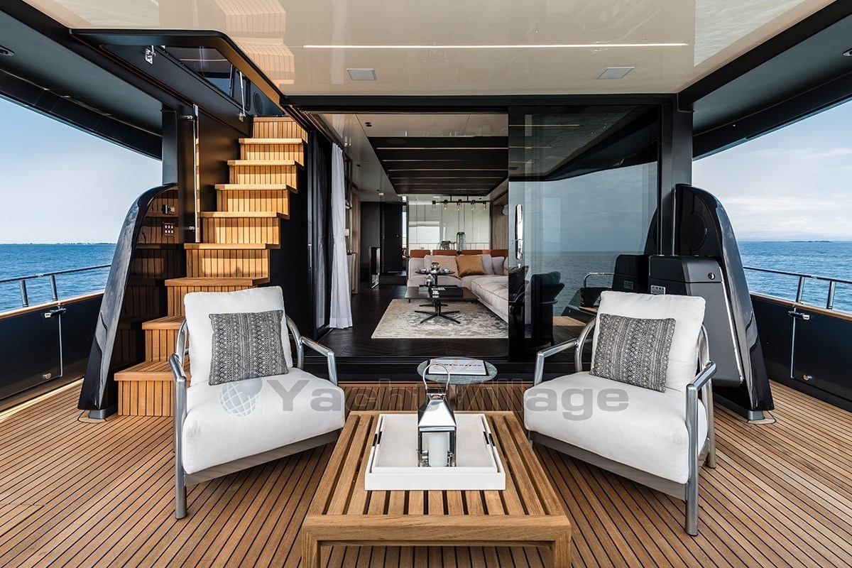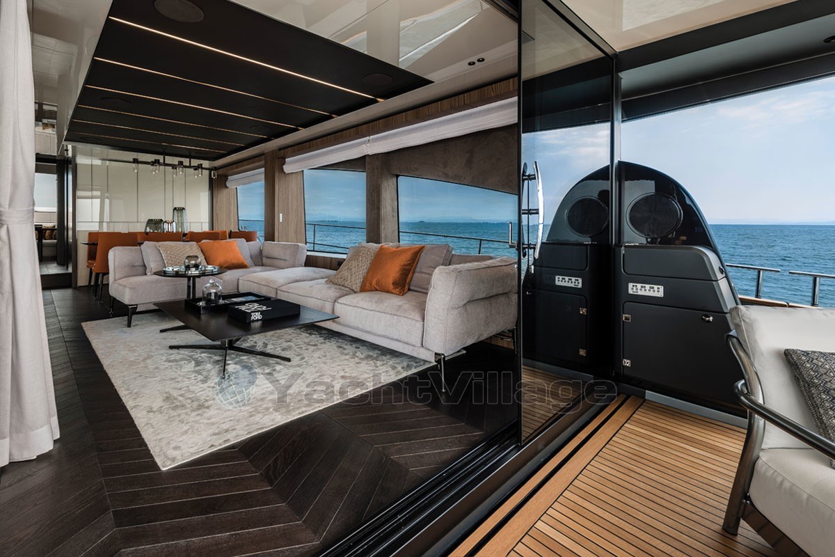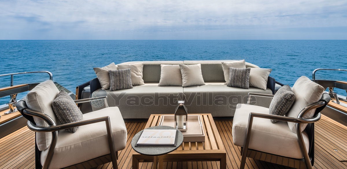 The fly-bridge is equipped with a large lounge and a sunbathing area. The aft swim platform is spacious and can be expanded, offering an outdoor shower and atmospheric lighting for the evening.