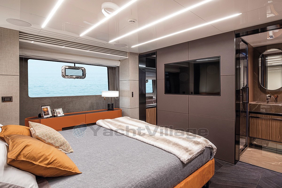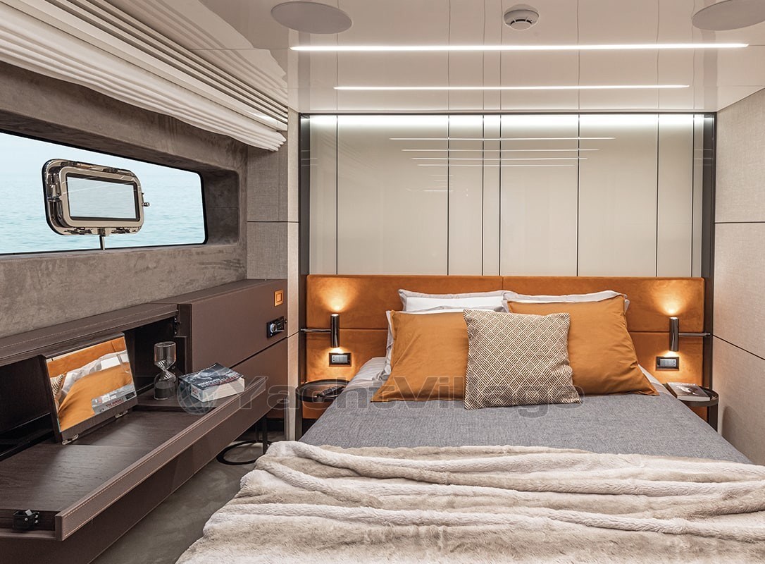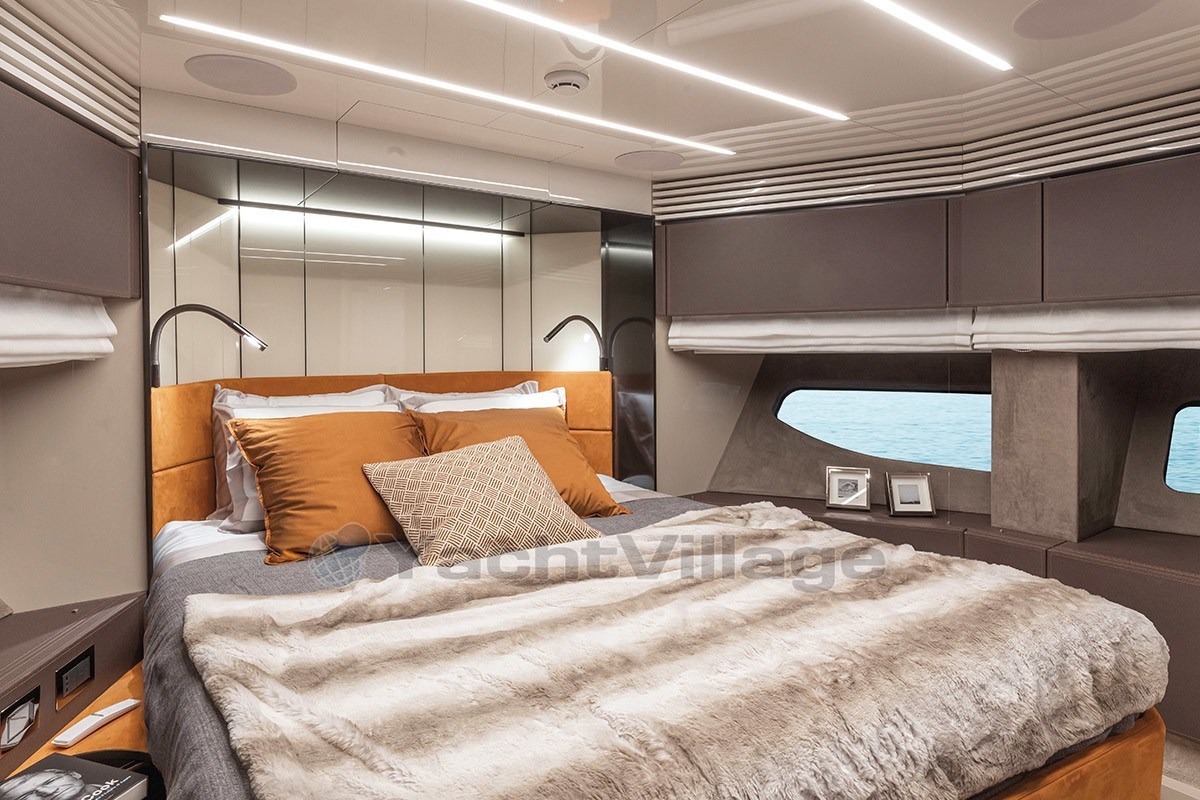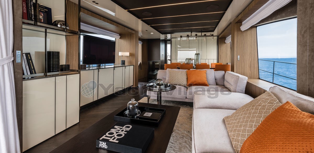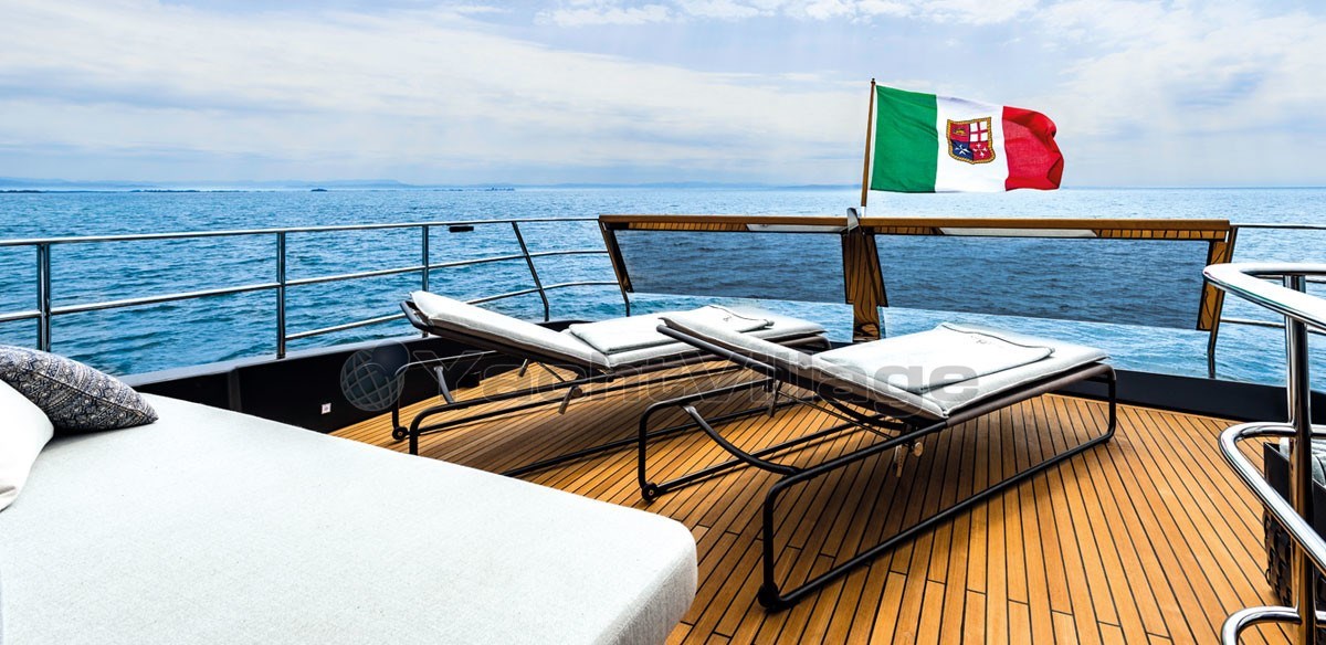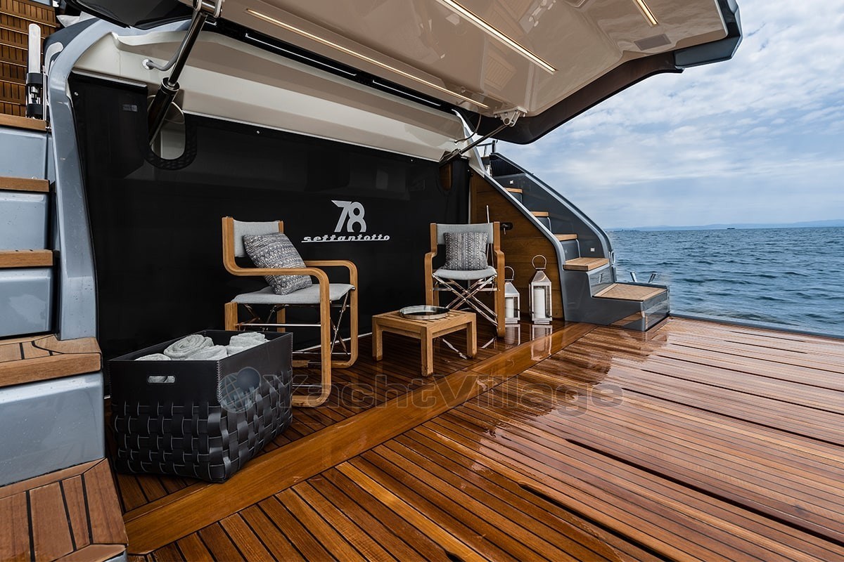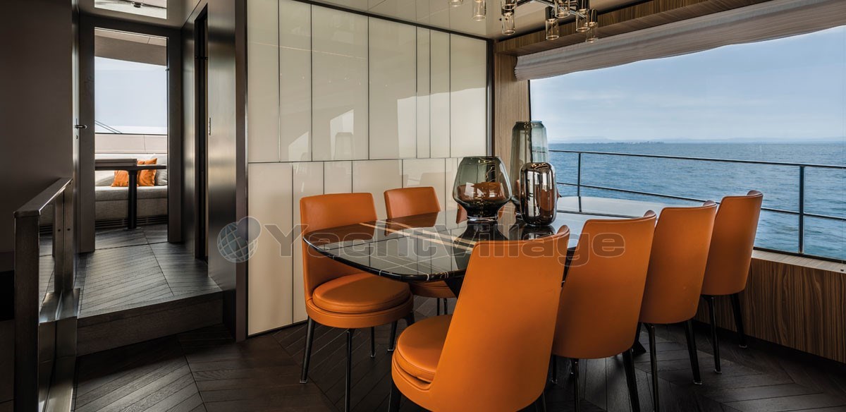 The fly-bridge is equipped with a large lounge and a sunbathing area. The aft swim platform is spacious and can be expanded, offering an outdoor shower and atmospheric lighting for the evening.