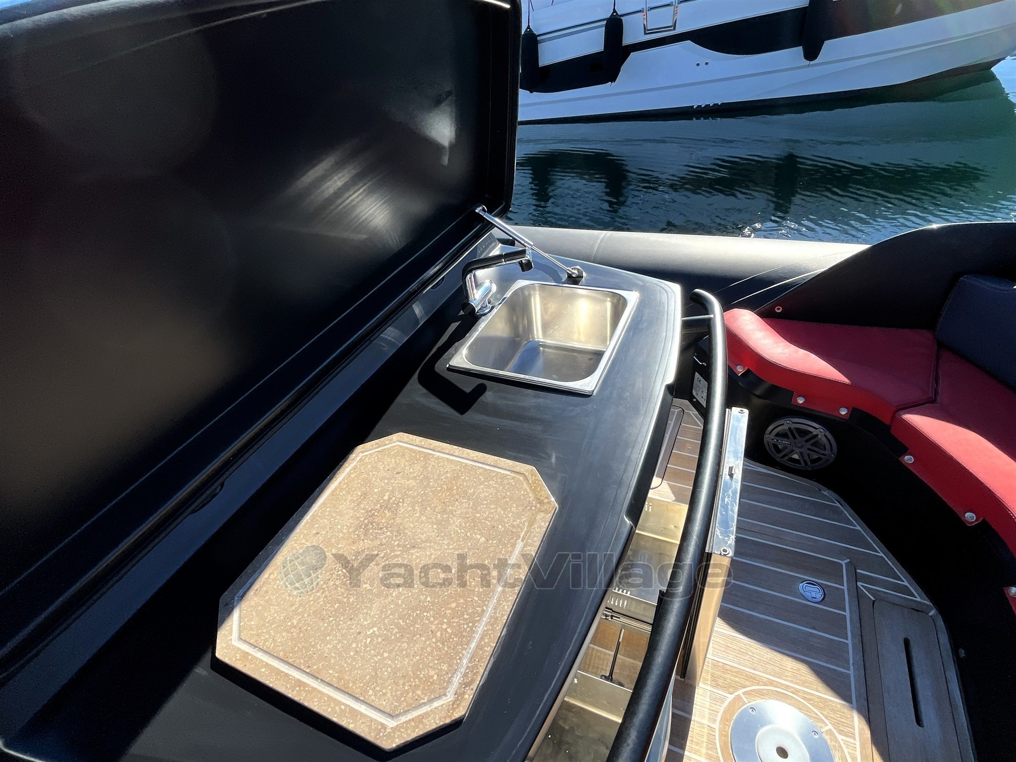 TEAK COCKPIT, CARBON BLACK TUBULARS, BOW THRUSTER - RETRACTABLE BIMINI ABOVE SUNDECK - STAINLESS STEEL WINDLASS WITH CAMERA - GPS ECO 12" RAYMARINE TOUCH - BOW THRUSTER - RAYMARINE VHF - DOUBLE FRIDGE - STEREO FUSION - RETRACTABLE SWIM LADDER - 220 V SOCKET WITH BATTERY CHARGER - TEAK COCKPIT AND PLATFORM - COMPLETE CUSHIONS - COCKPIT WITH SINK, DOUBLE FRIDGE, DIVING LIGHTS, WATER SKI POLE, SAFETY EQUIPMENT