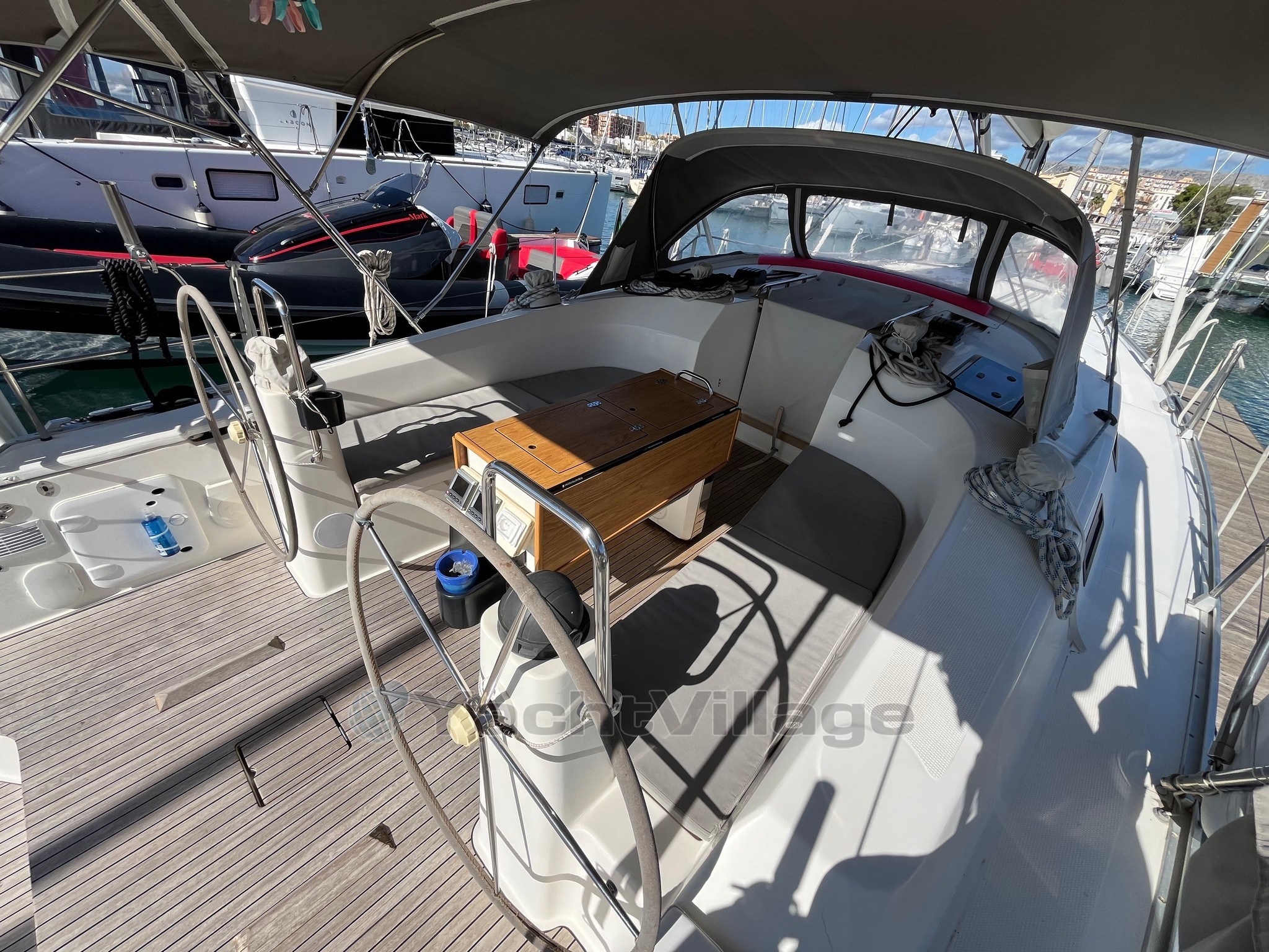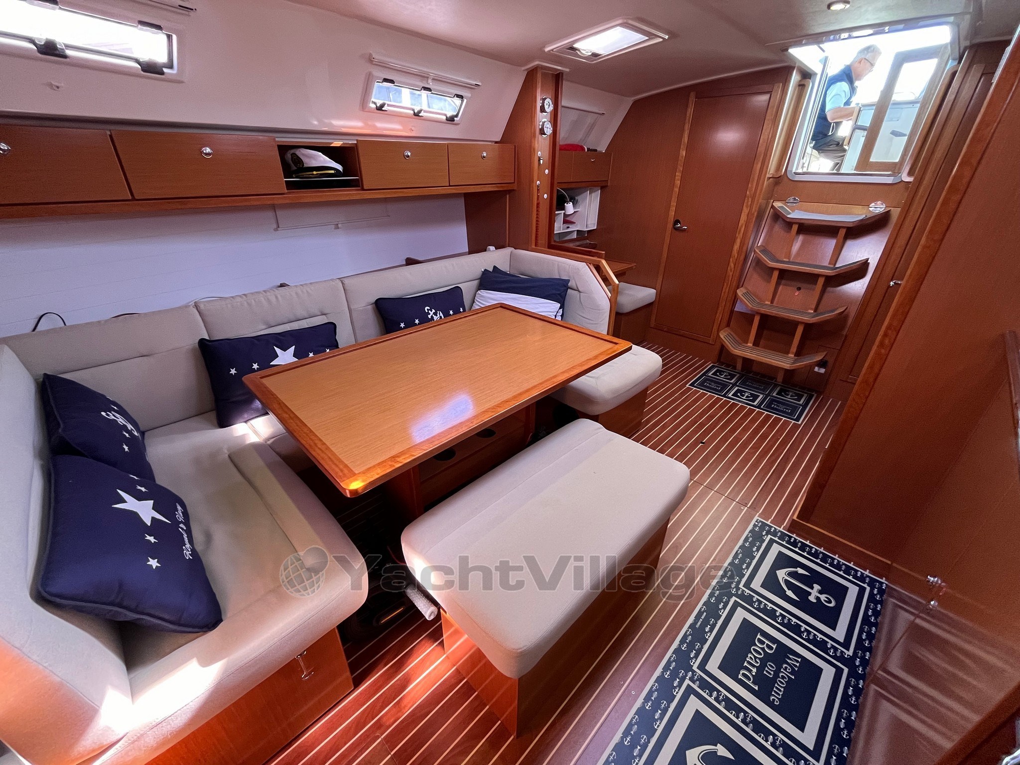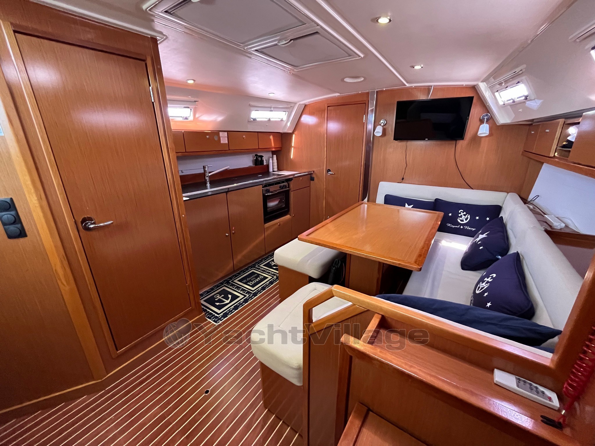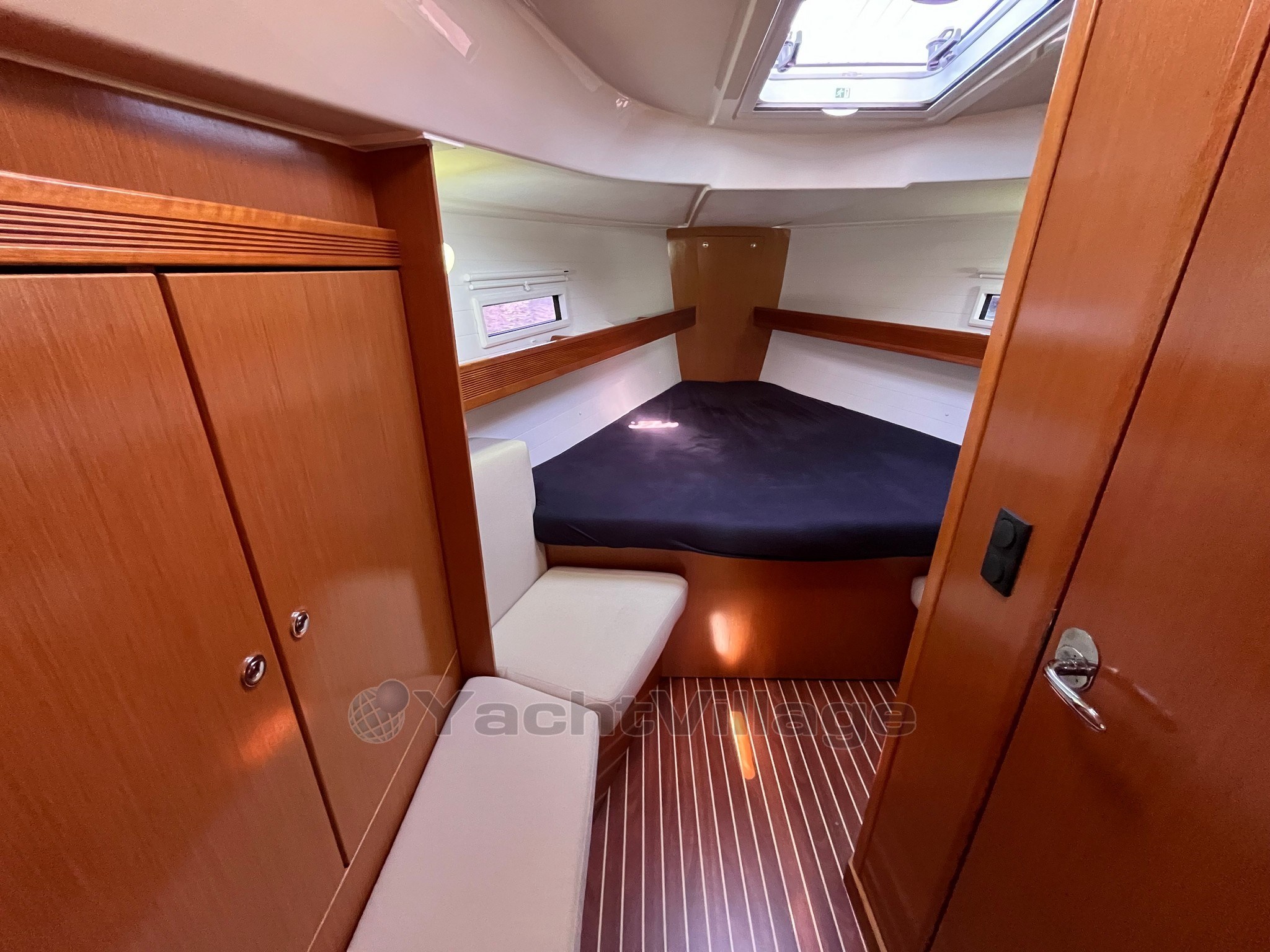 On deck, the large and well-organized cockpit, with double wheelhouse, central table and folding aft platform, guarantees comfort and safety even with a small crew. The maneuvers deferred in the cockpit make sailing simple and pleasant.