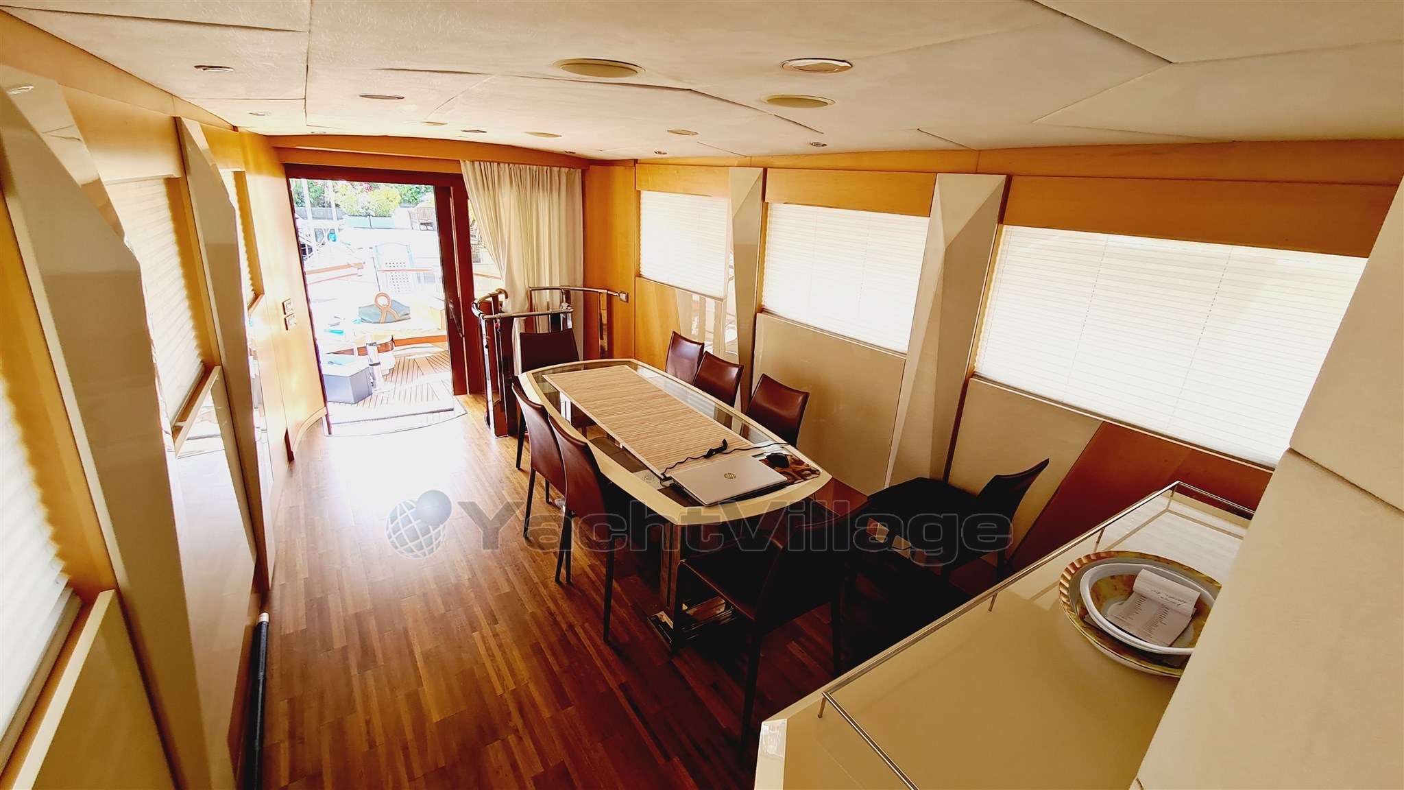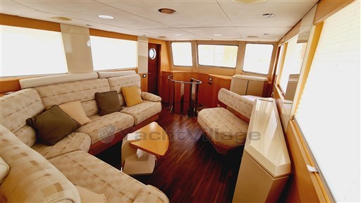 Estructurado en tres cubiertas, Gaia está organizado con un comedor a popa de cuya, una escalera circular conduce a la cubierta inferior, que alberga dos camarotes y dos baños. Desde el salón de popa, continuando hacia la proa a la izquierda, está la cocina y, luego, el puente en posición elevada. También está el salón principal, con una segunda escalera circular que conduce a la cubierta inferior, reservada para la cabina del propietario (de viga completa) y VIPs. La mosca dispone de un bimini y una gran zona para tomar el sol, así como una segunda estación de timón y un tender de 5 metros. En la cubierta, hacia la proa, también hay un bote de vela de más de 4 metros. También hacia la proa, una pasadiza conduce a la zona de la tripulación (con dos camarotes).