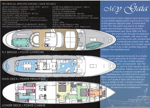 el yate ha sido completamente restaurado en Italia, donde el arquitecto Alessio Liuni ha creado nuevos interiores (los actuales) y equipado con todas las comodidades modernas, así como la instalación de nuevos motores y generadores.