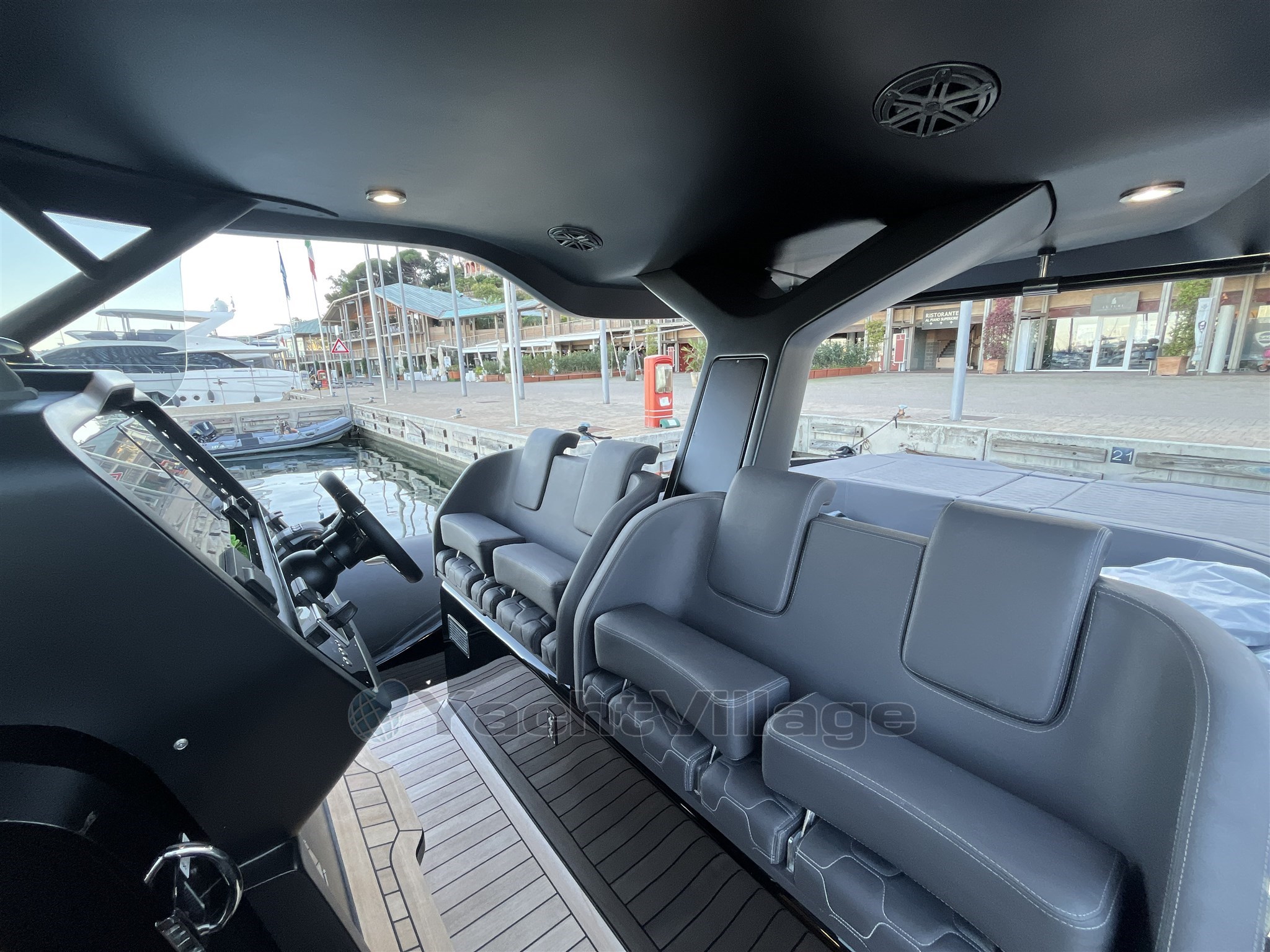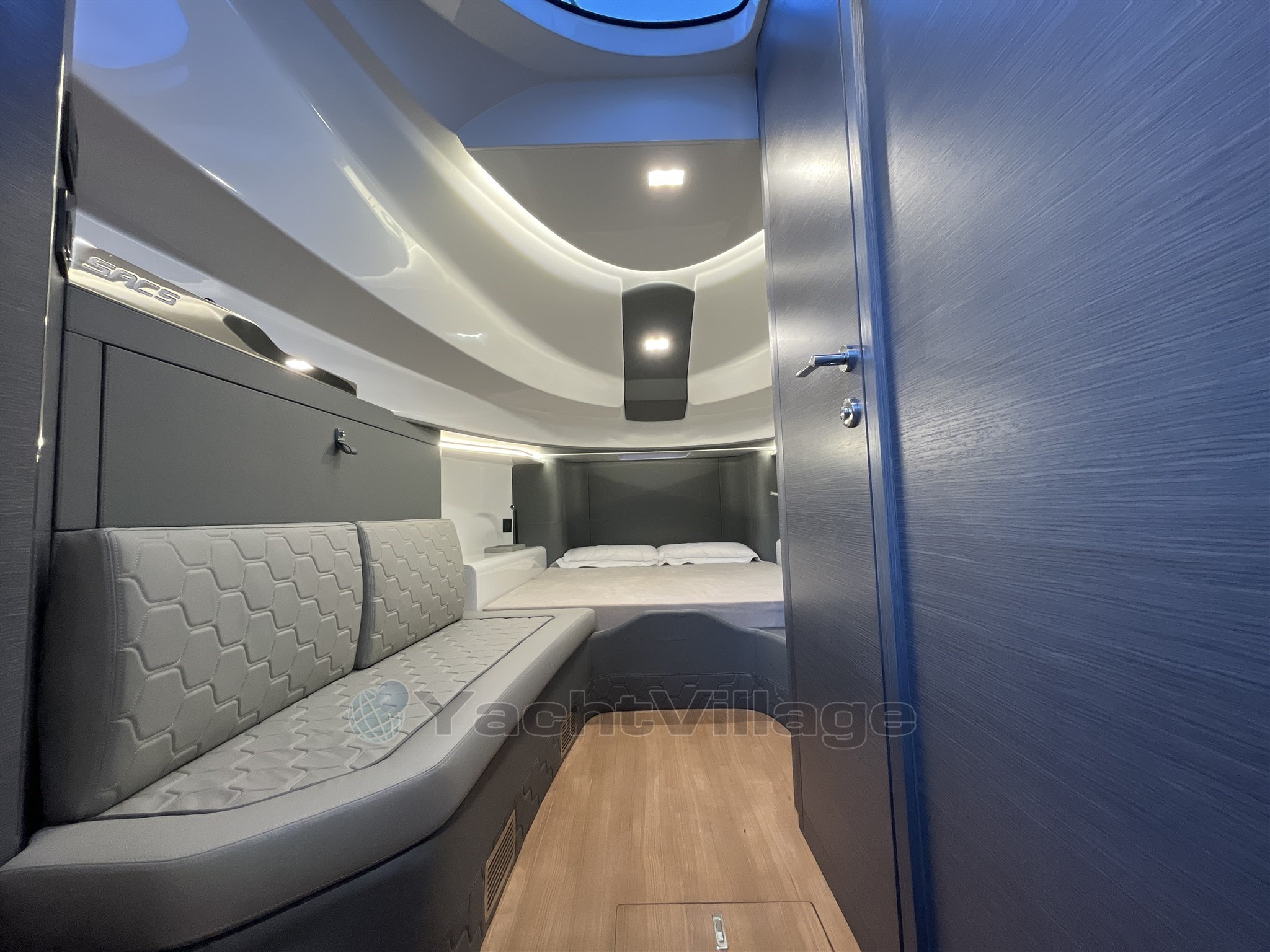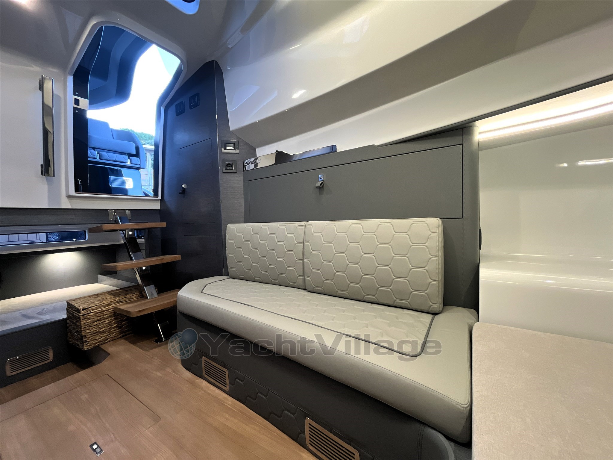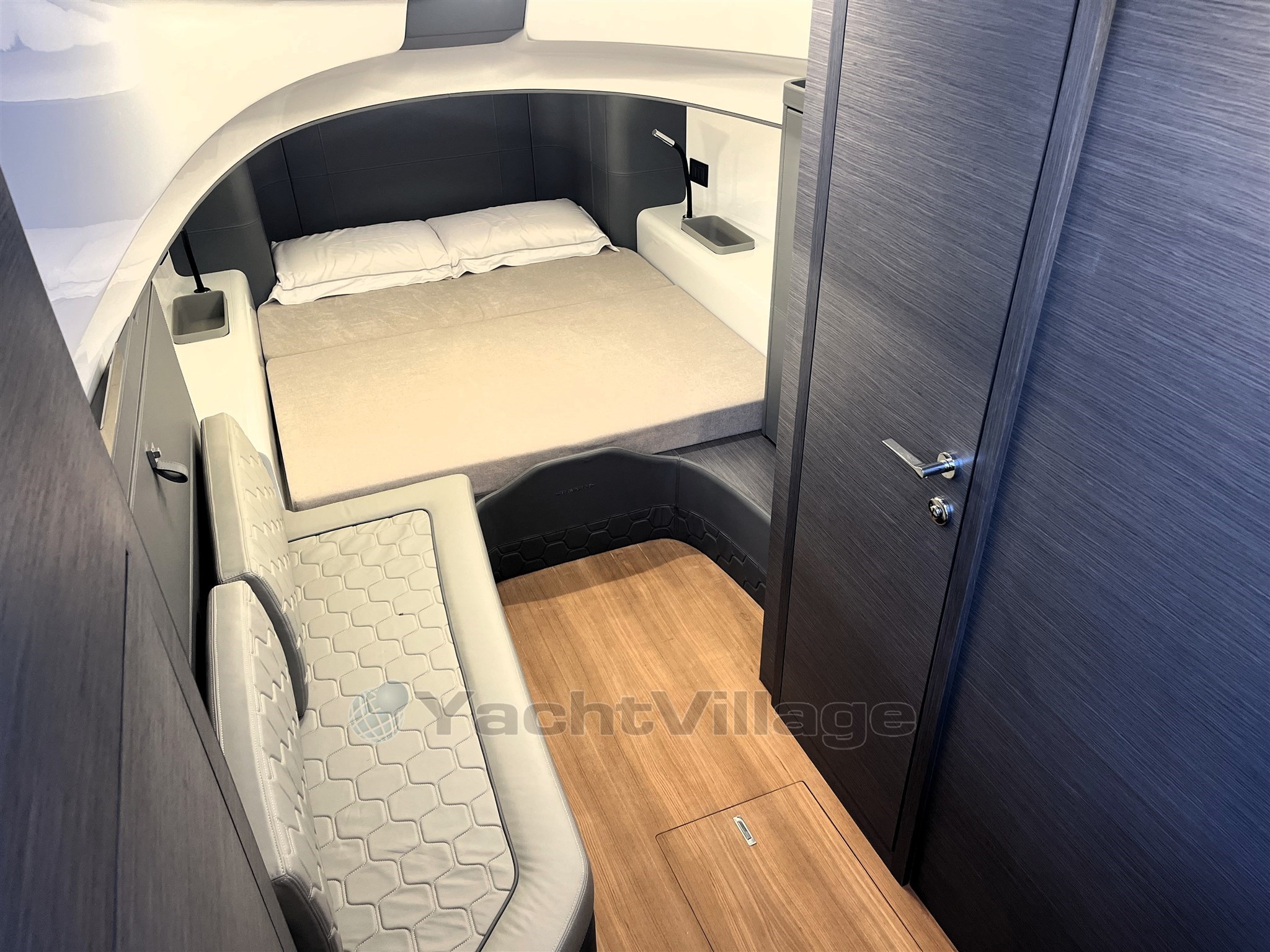 Los interiores son elegantes y funcionales, con una zona de baño separada, un camarote doble de proa y un camarote de invitados de popa también equipado con una cama doble. El diseño de Christian Grande garantiza una combinación perfecta de estilo, energía y potencia.