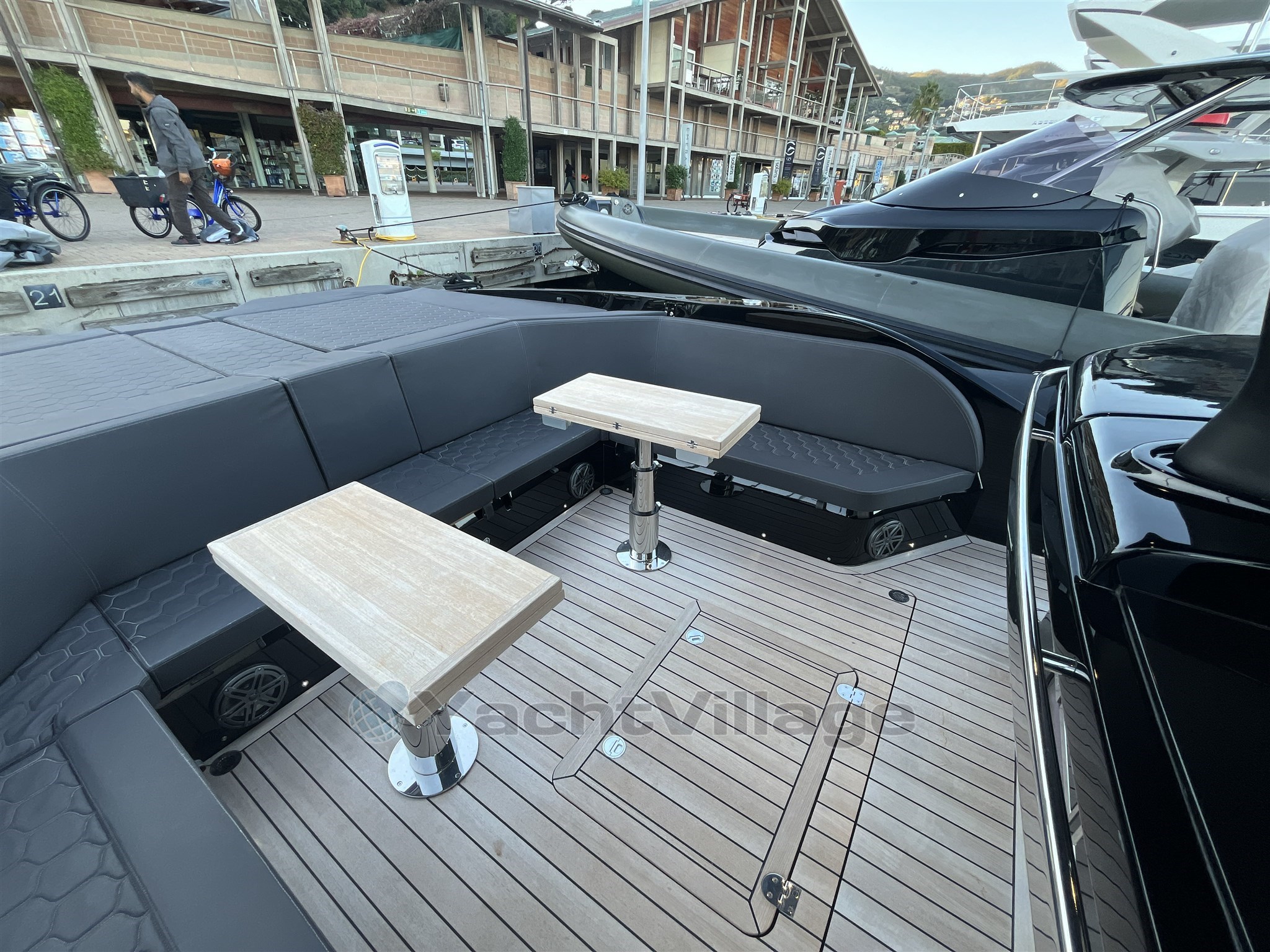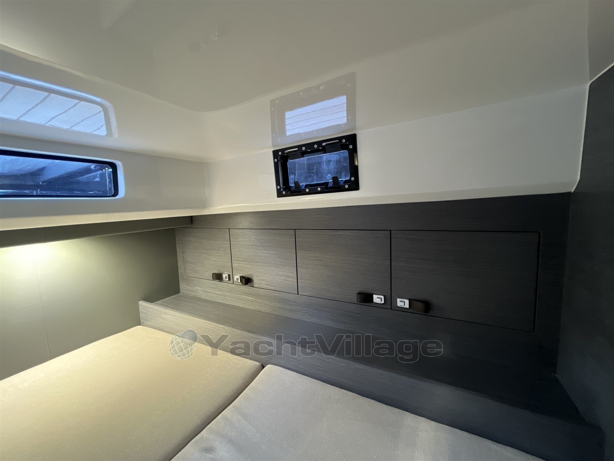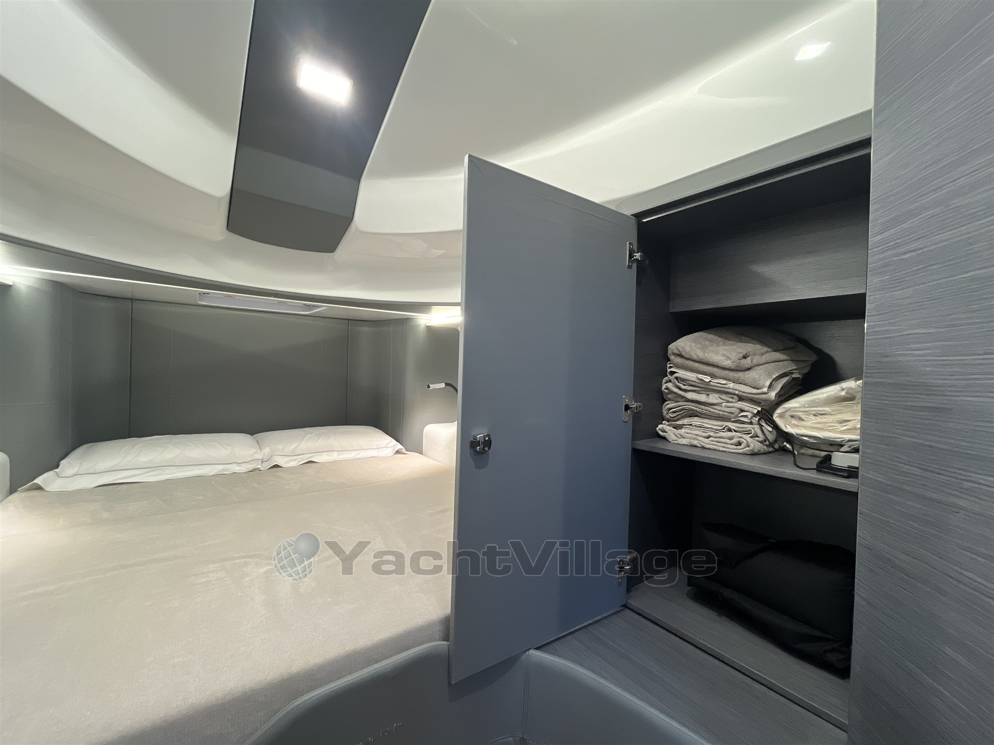 Los interiores son elegantes y funcionales, con una zona de baño separada, un camarote doble de proa y un camarote de invitados de popa también equipado con una cama doble. El diseño de Christian Grande garantiza una combinación perfecta de estilo, energía y potencia.
