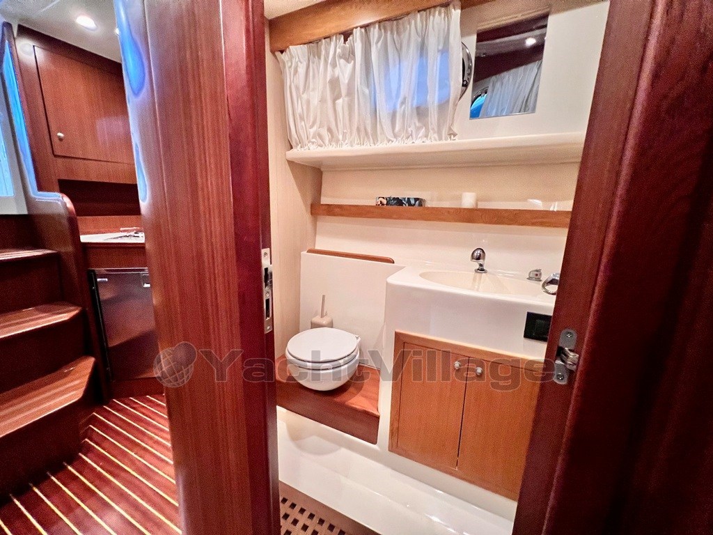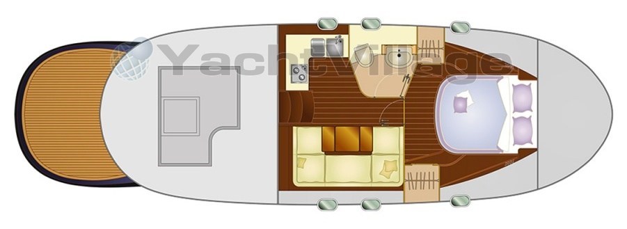 La cuisine immédiatement à gauche en entrant, bien que sous le pont, est visible depuis le cockpit et est en fait adjacente et communique avec l’extérieur.