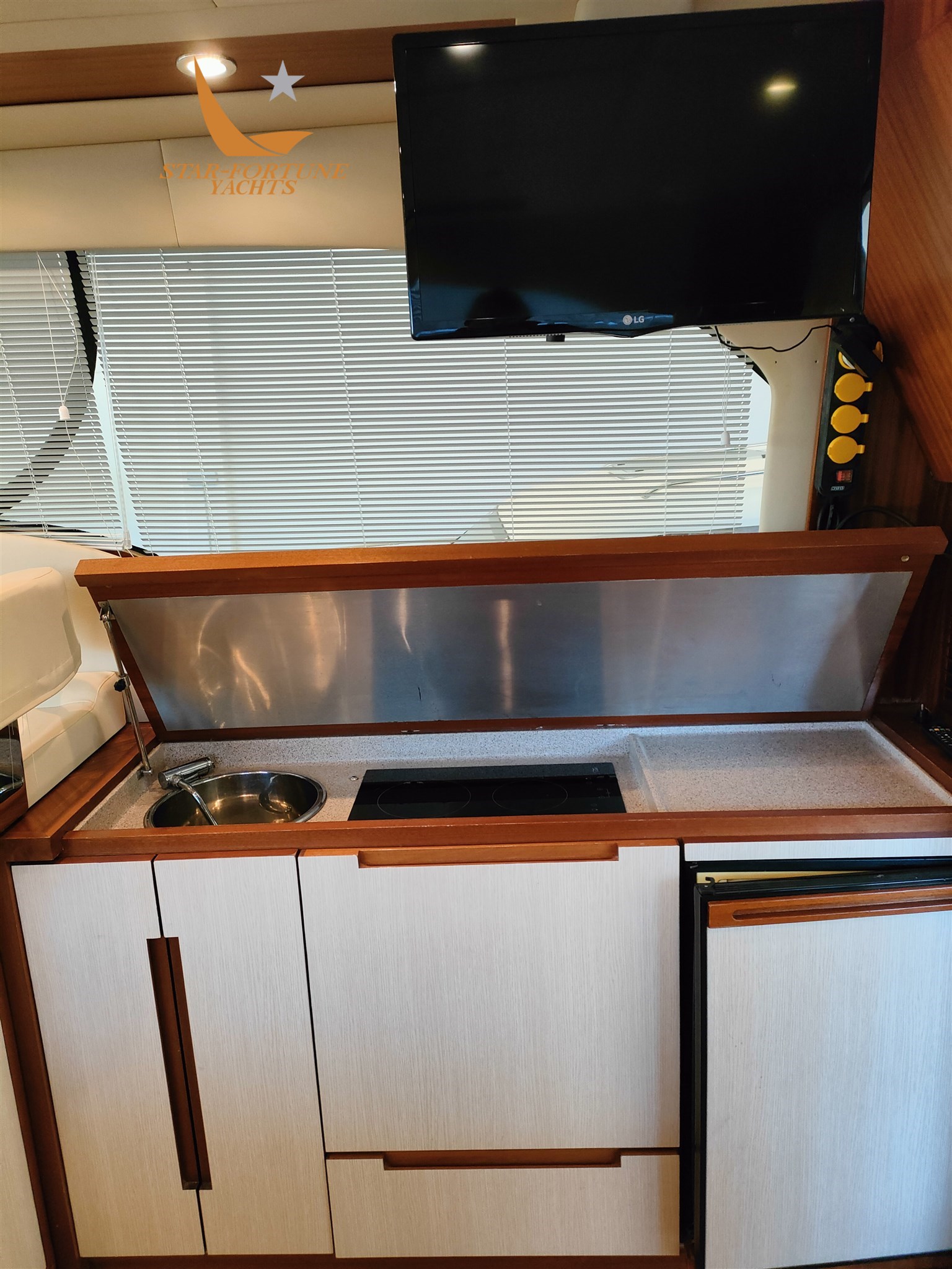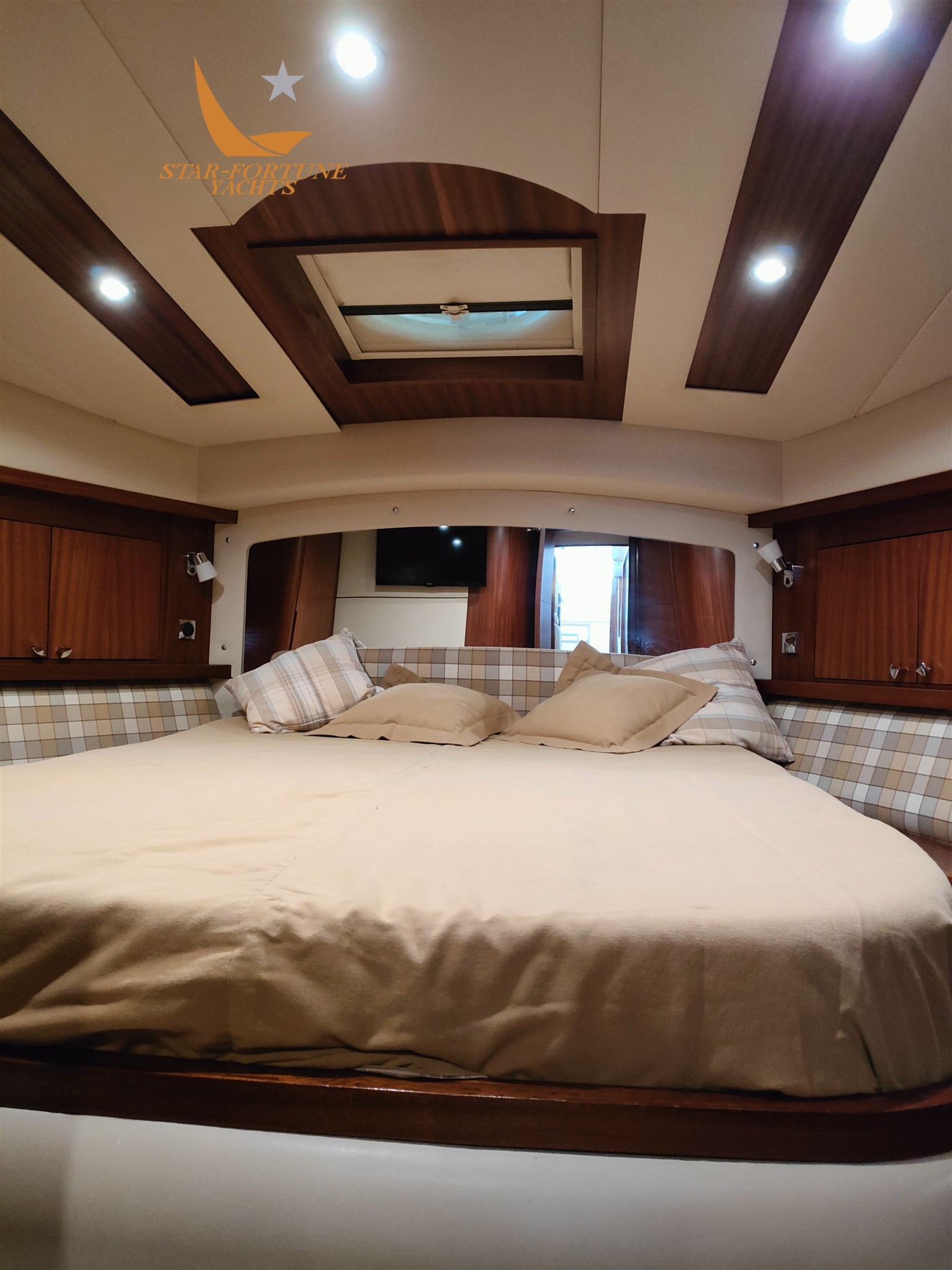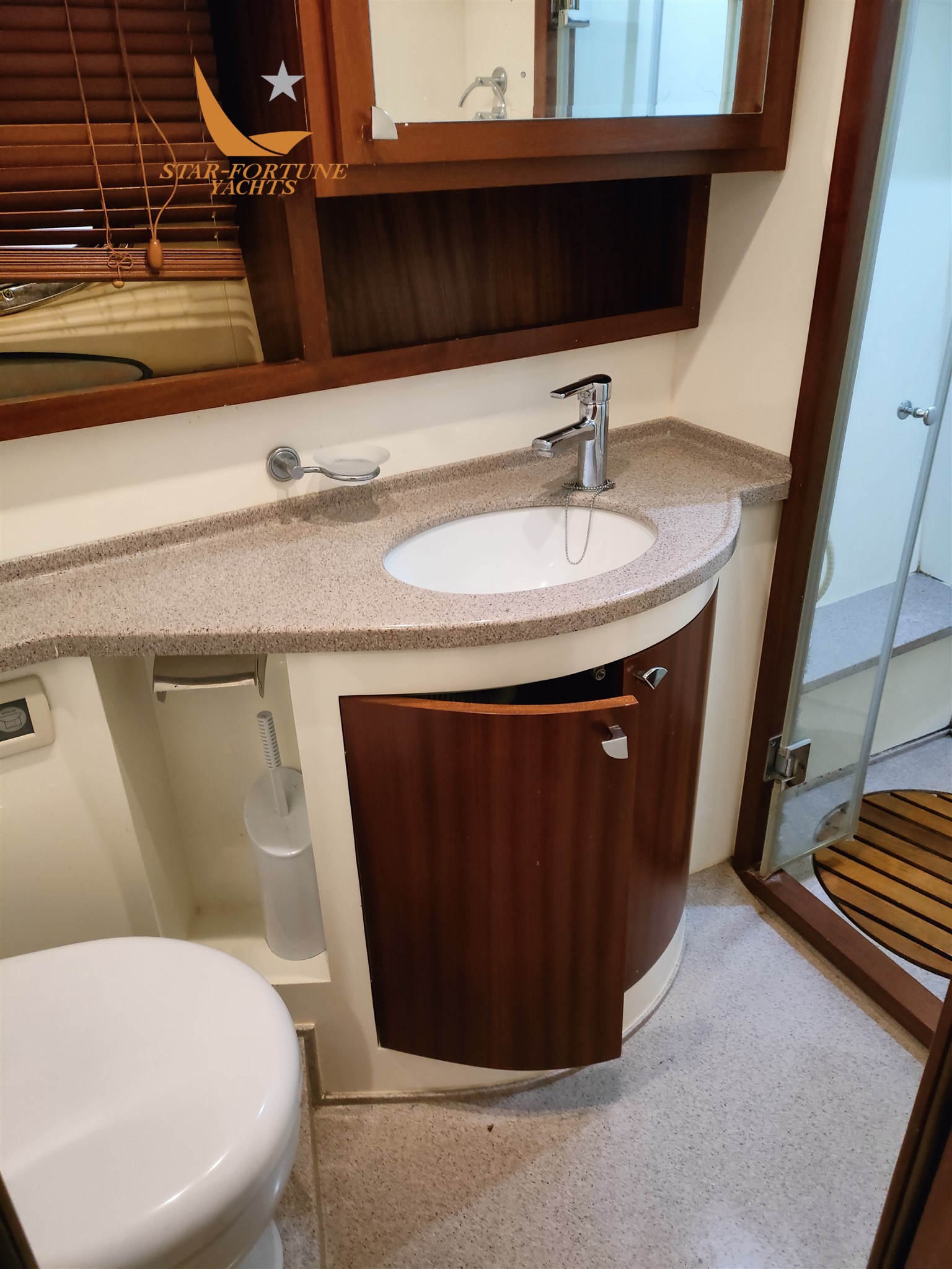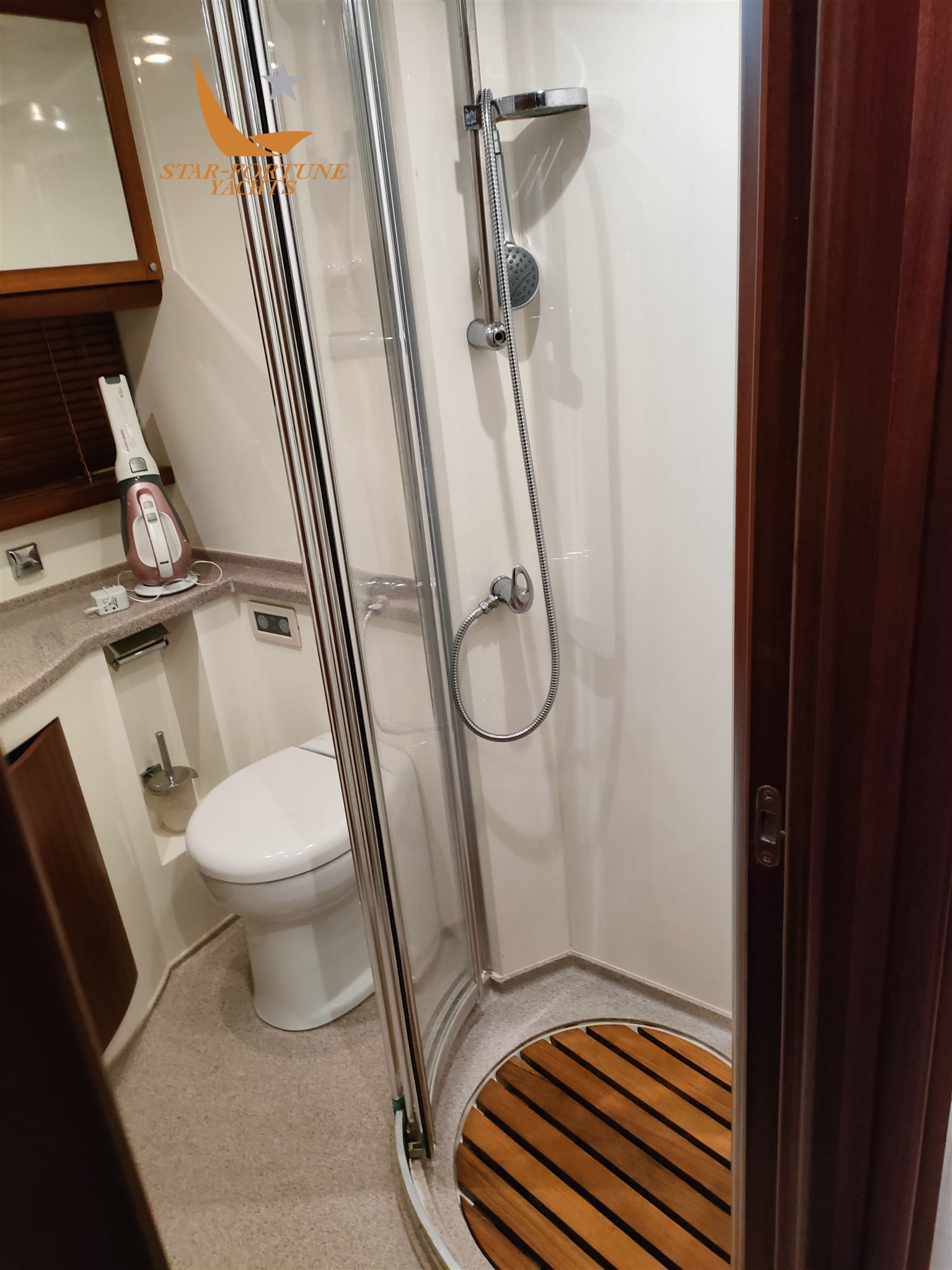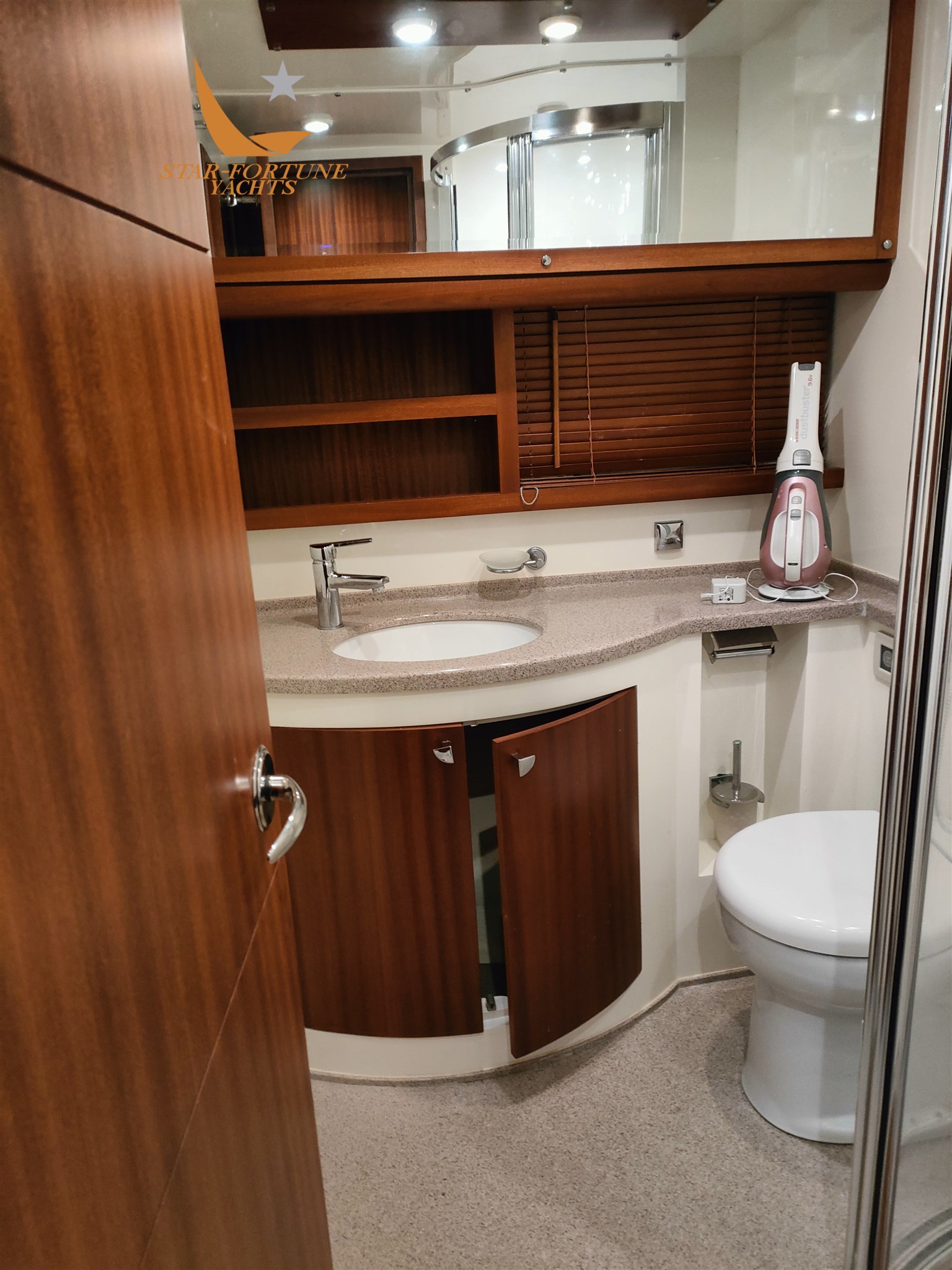 Cabine principale à l’avant avec lavabo, toilettes électriques et cabine de douche dédiée