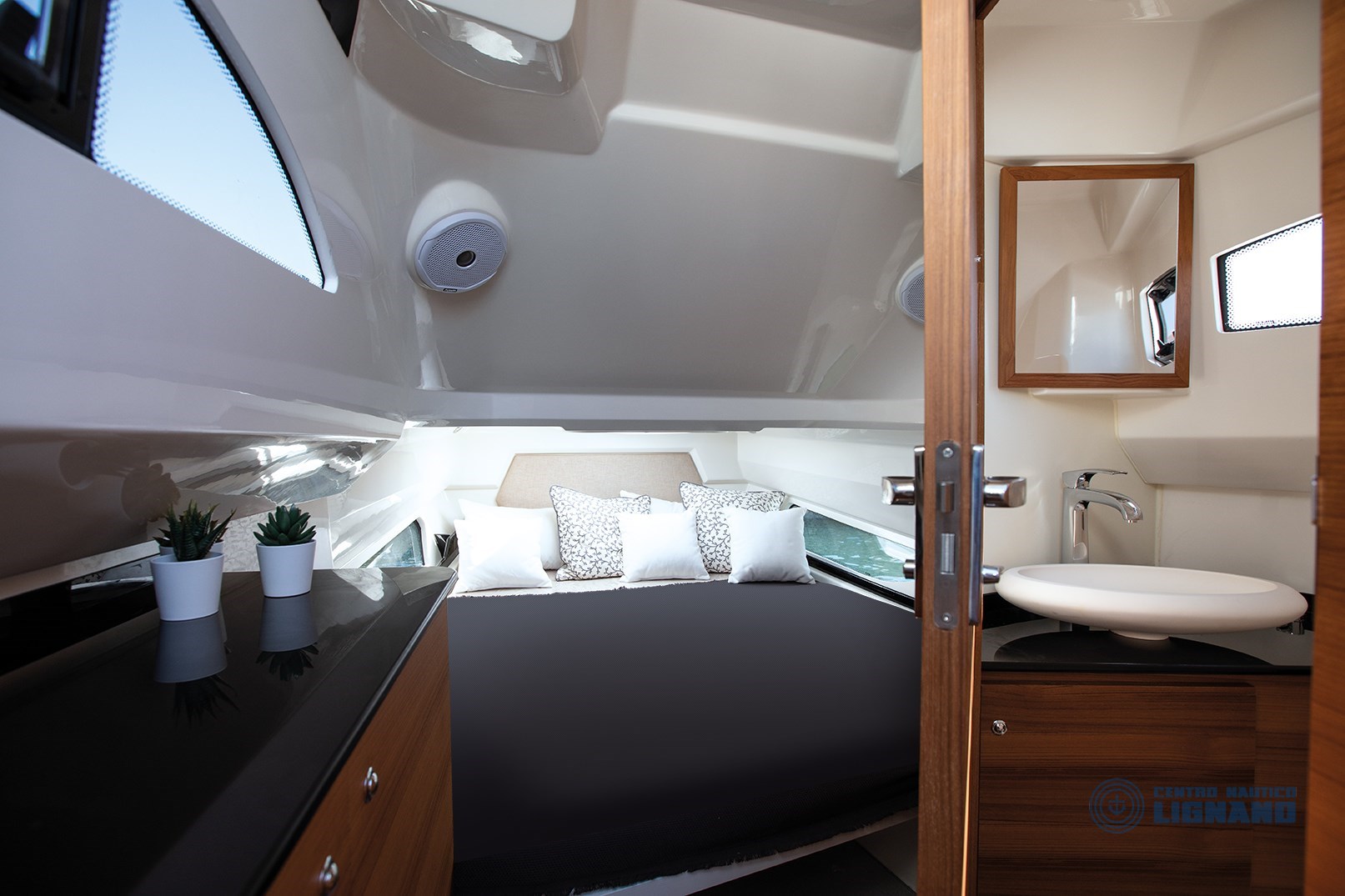 Cabine : Fenêtres de coque avec compartiment de rangement, Lit deux places avec grands coffres, Armoire de rangement (avec possibilité d’installer réfrigérateur), Armoire avec évier, Cloison d’intimité pour toilettes avec porte, lavabo et douche dans la cabine, Toilette avec broyeur et réservoir d’eaux noires avec capteur bluetooth externe, Compartiment de rangement, Trappe, Miroir et profilé en bois, Lumières de courtoisie, Lampe de lecture, prises USB. Sont également inclus un réfrigérateur de 39 litres (cabine), un toit en teck synthétique (Eva 9 mm), un toit en T en fibre de verre et en acier inoxydable.