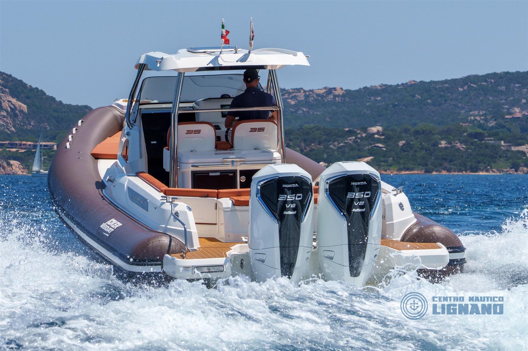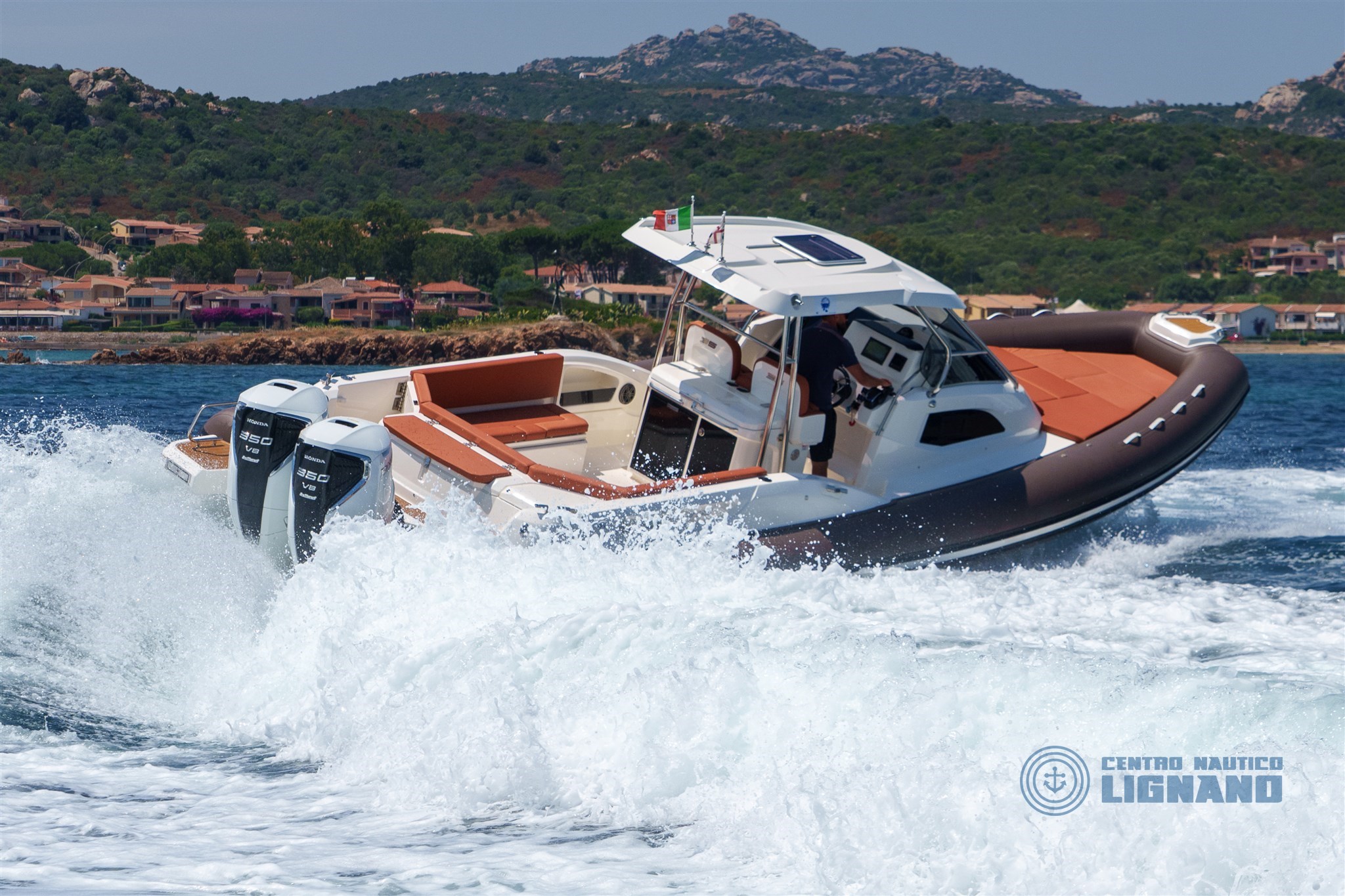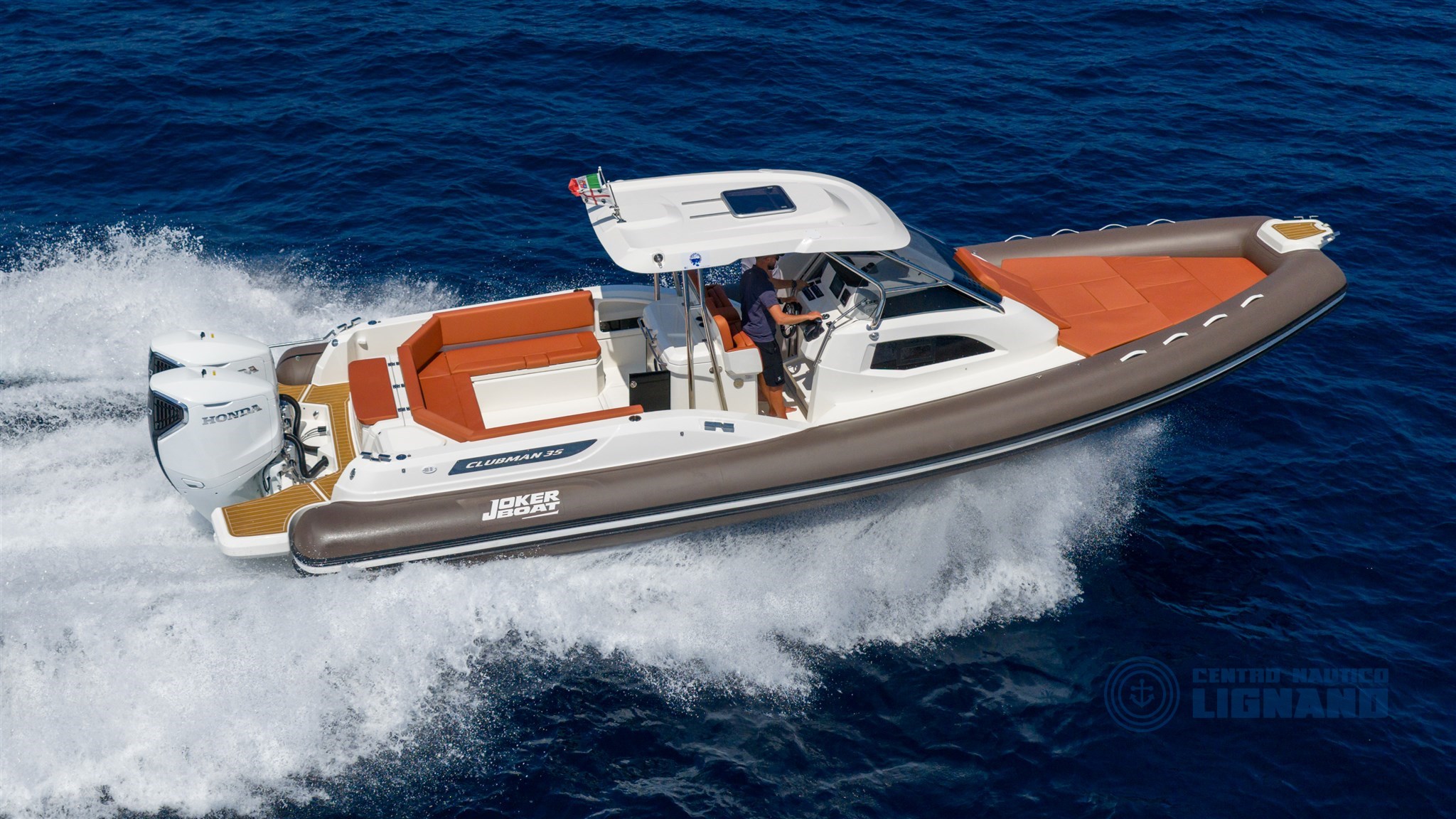 Offre Centro Nautico Lignano pour un tout nouveau dériveur Joker Boats 35 Clubman avec 2 moteurs Honda Marine BF350 Total White, couleur tubulaire de votre choix, complet avec accessoires dont : Haut-parleurs audio nr. 6, 12V, 4' AMP chargeur de batterie avec prise de quai et câble, certifié CE, Couleur du carénage, Console avec pare-brise, Coussins de bain de soleil et sièges conducteur, Crochets pour suspension, Crochets de ski, Gonfleur électrique, Système de douche, Kit de réparation, Feux de navigation, manuel d’utilisation, pagaie avec gaffe de bateau, Panneau utilitaire 16 fonctions, Pompe de cale x 2, Échelle intégrée en acier inoxydable, Signal sonore, Réservoir d’eau 170 lt, Réservoir de carburant en acier inoxydable 700 lt, Souffleur, Table électrique, Coussin d’extension de bain de soleil, Main courante dans la console, Treuil électrique avec ancre et chaîne. Boîte de guidage : évier, planche à découper, réfrigérateur de 75 litres, poubelle.