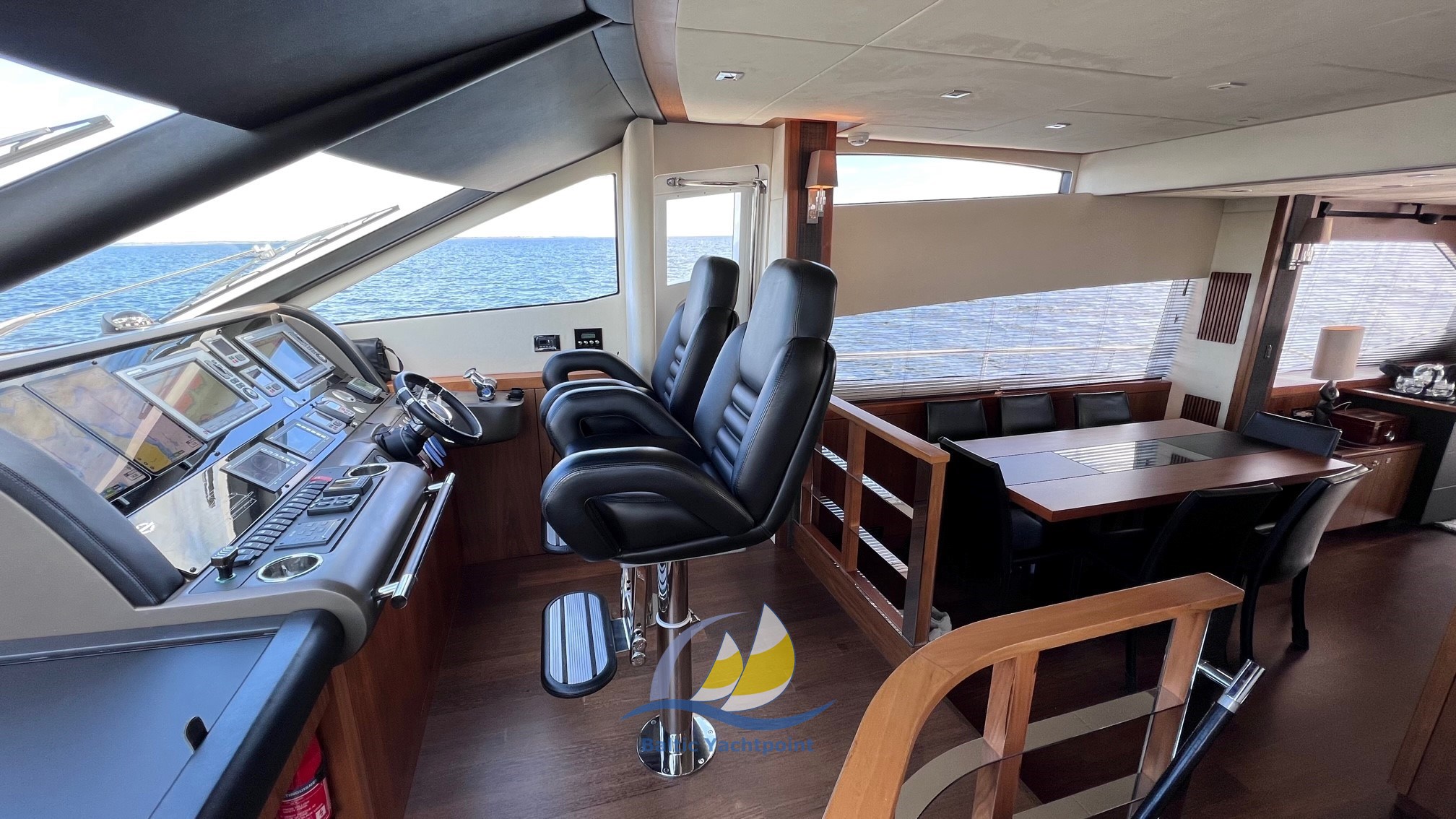 Questo MANHATTAN 73 ha un ampio salone con soggiorno e zona pranzo, che è stato appositamente progettato per il proprietario, così come finestre panoramiche e un ampio pozzetto. Dispone inoltre di un ampio prendisole che include un tetto apribile elettrico hardtop circondato da splendide finestre trasparenti rimovibili per garantire che possa essere goduto in qualsiasi condizione atmosferica. Apri il tetto di notte e goditi un cocktail sotto le stelle o chiudi il baldacchino per tenere fuori la pioggia - non devi rimettere le coperte per ore alla fine della giornata. Il solarium contiene una TV integrata nell'hardtop, un bar ben fornito con frigorifero, fabbricatore di ghiaccio e grill e una fantastica vasca idromassaggio; Ideale per i bambini e perfetto per viaggiare verso nord.