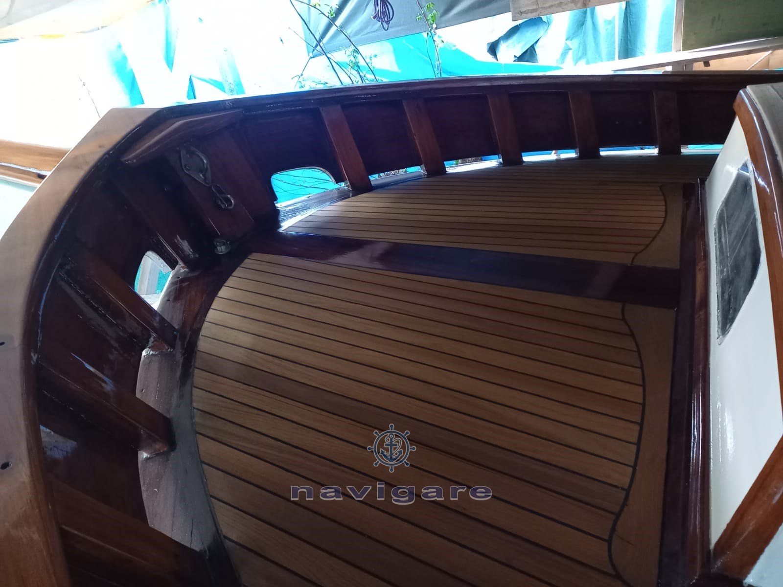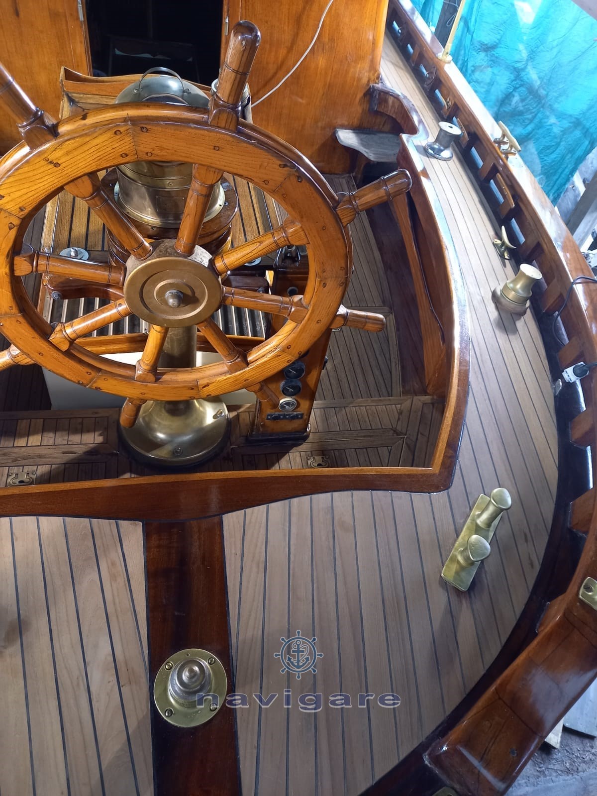 Cogoleto nell'anno 1963 in legno lamellare a triplo strato sul quale è stato installato un motore entro bordo diesel, di pari data, della ditta LISTER, per una potenza di CV 27 a 2800 giri/m. a 3 cilindri a timoneria idraulica. Vetus.