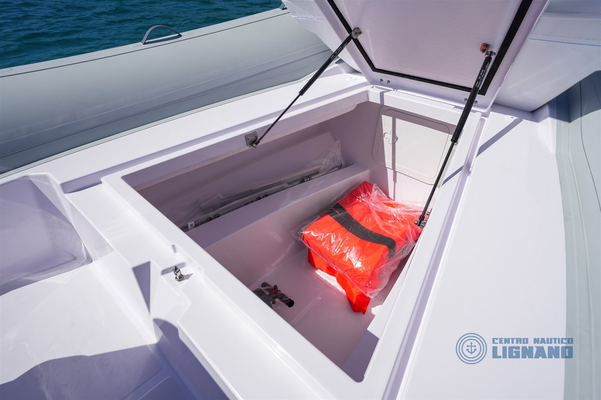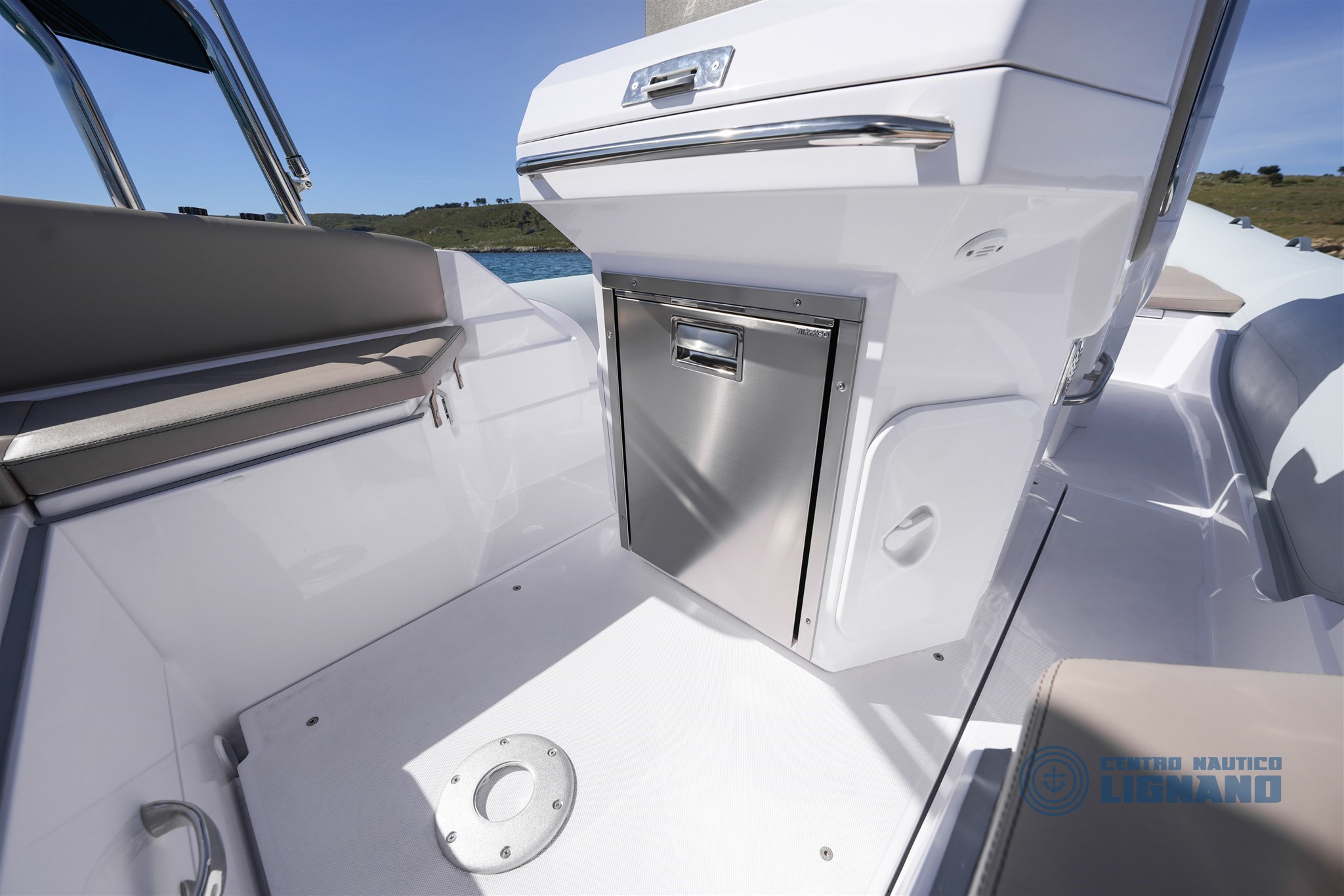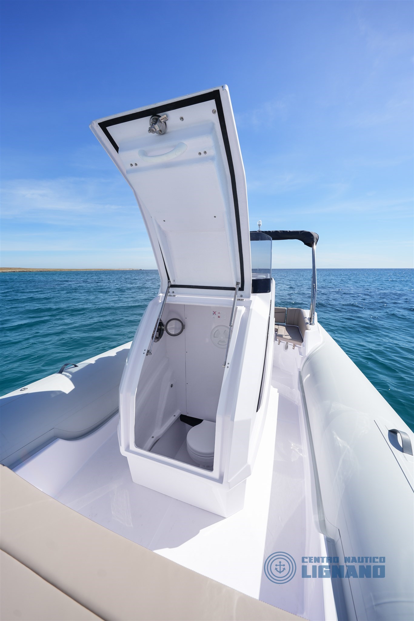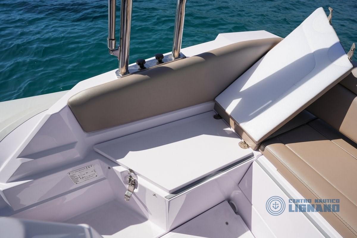 Verricello Elettrico, bagno WC chimico in console, Frigorifero incassato in acciaio inox, plancette di poppa allungate, impianto doccia con serbatoio acqua da 80lt, telo copri console!
