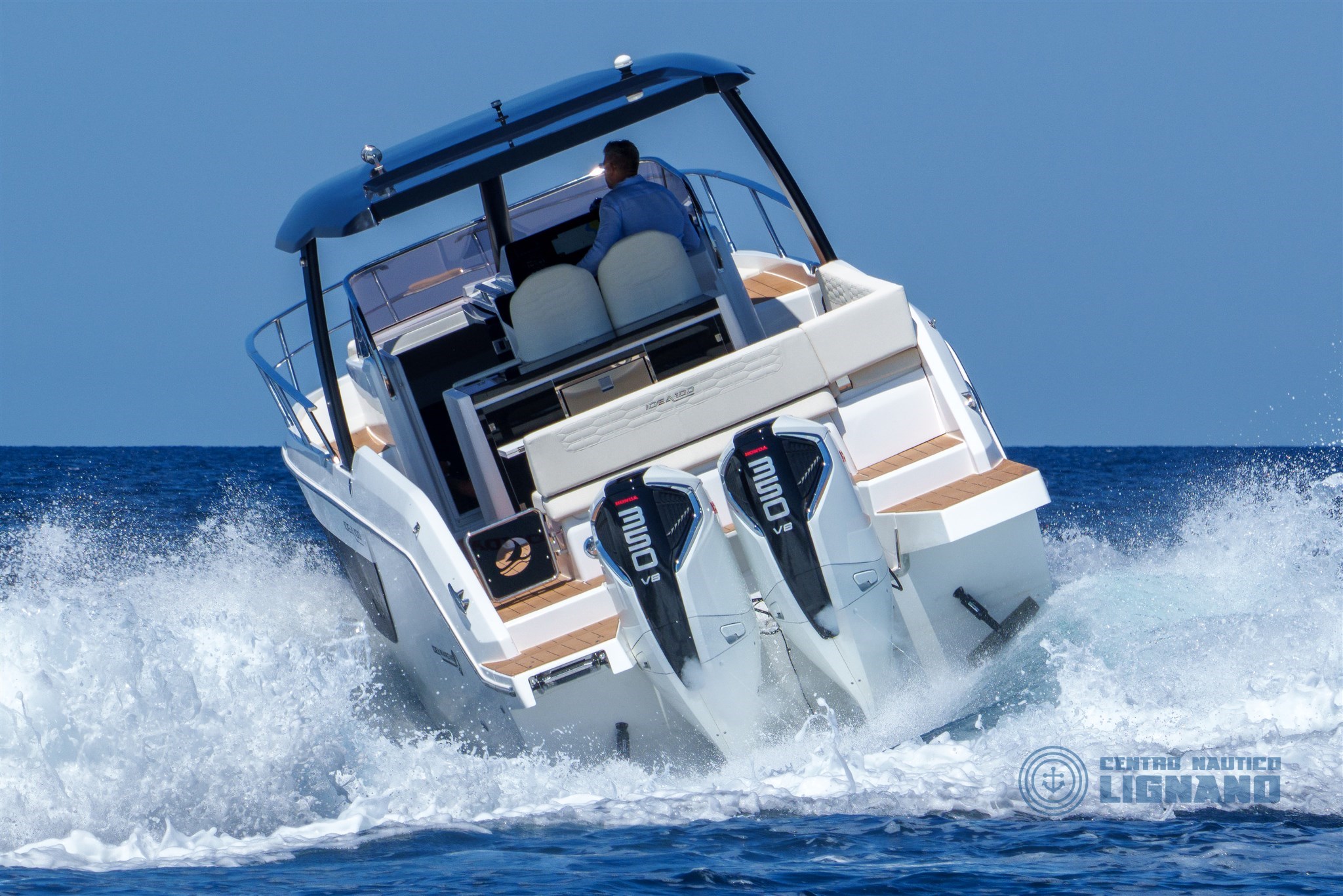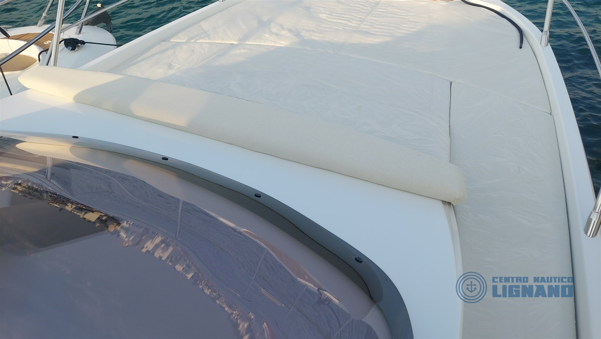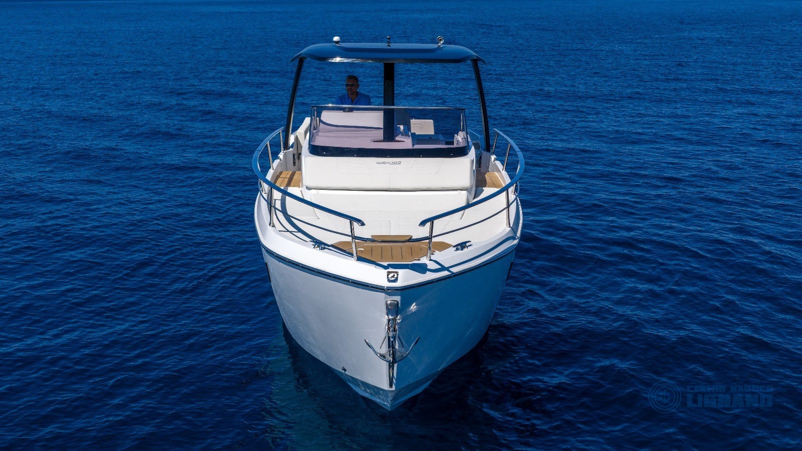 Cuscineria esterna grigia Nimbus Cloud, Carena e coperta colore bianco White, Illuminazione led per navigazione e fonda, Cuscineria interna tinte standard (Copriletto e divani tessuto art. 5450), Pavimenti interni Abet 1679 ciliegio tenue, Cuscini arredo 40 x 40 Art. 5435, Pareti laminato RAL 7030 opaco, Cielini e fianchi tessuto Art. 5430, Luci in cabina di prua e cabina di poppa, Mobile esterno con wetbar e lavello, Bagno separato con luce e mobile con lavello, Box doccia con pannelli di separazione, Impianto pompe di sentina automatiche a prua e a poppa, Mobile in legno in cabina con piano antigraffio e contenitori, Armadio in cabina di poppa, Quadro elettrico in cabina, Pannello utenze con impianto elettrico, Tavolo esterno di poppa con gambe telescopiche, 6 oblò apribili nelle cabine e bagno, Doccia esterna, WC elettrico marino con impianto serbatoio acque nere, Impianto doccia in bagno, Cabina di poppa separata con porta, Bussola incasso retroilluminata, Scaletta a mare in acciaio inox.