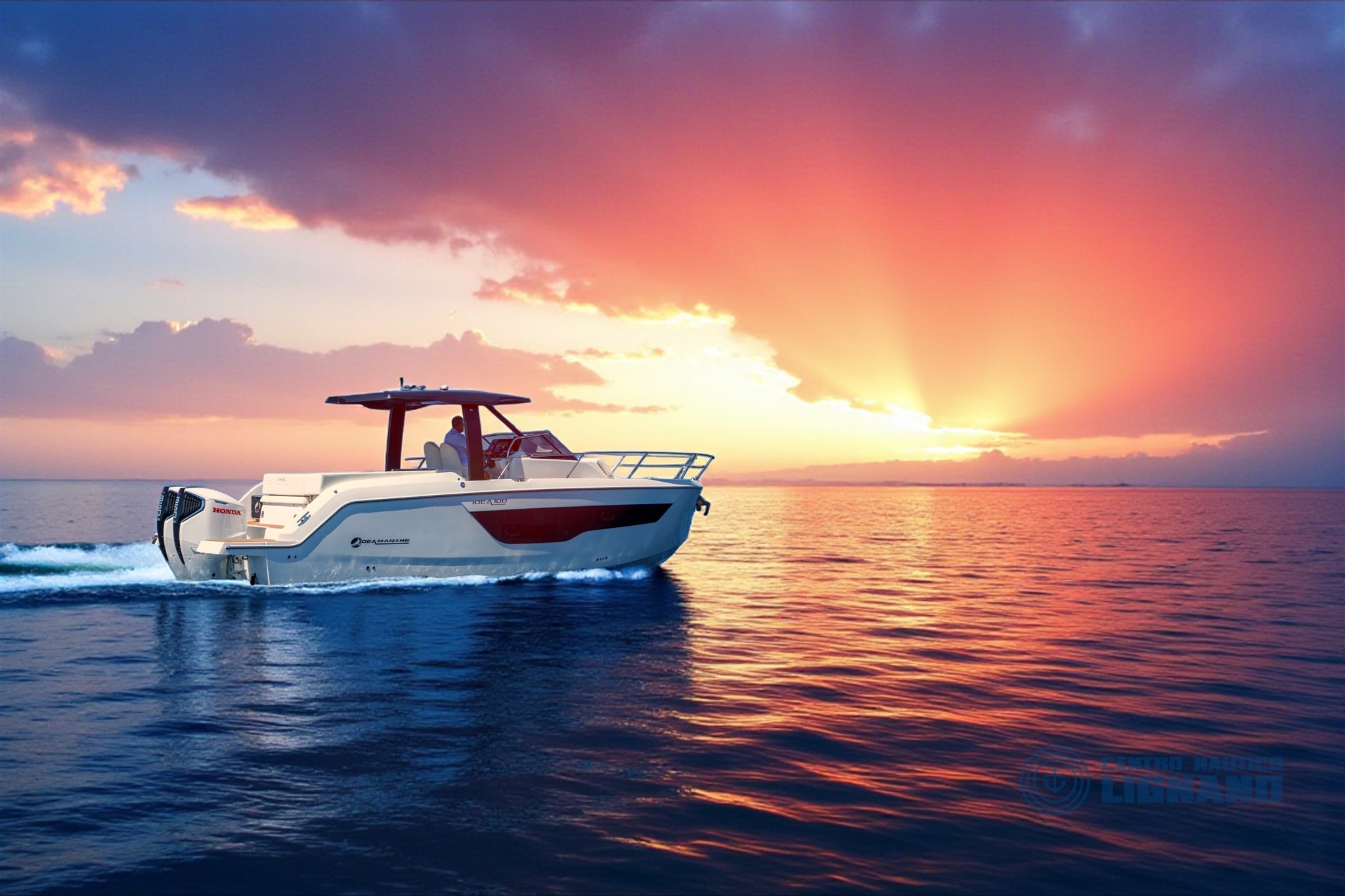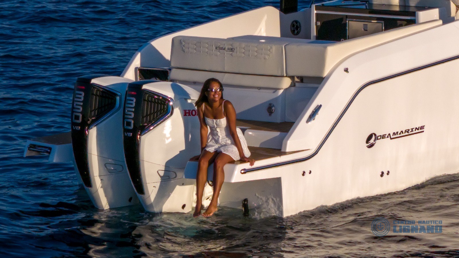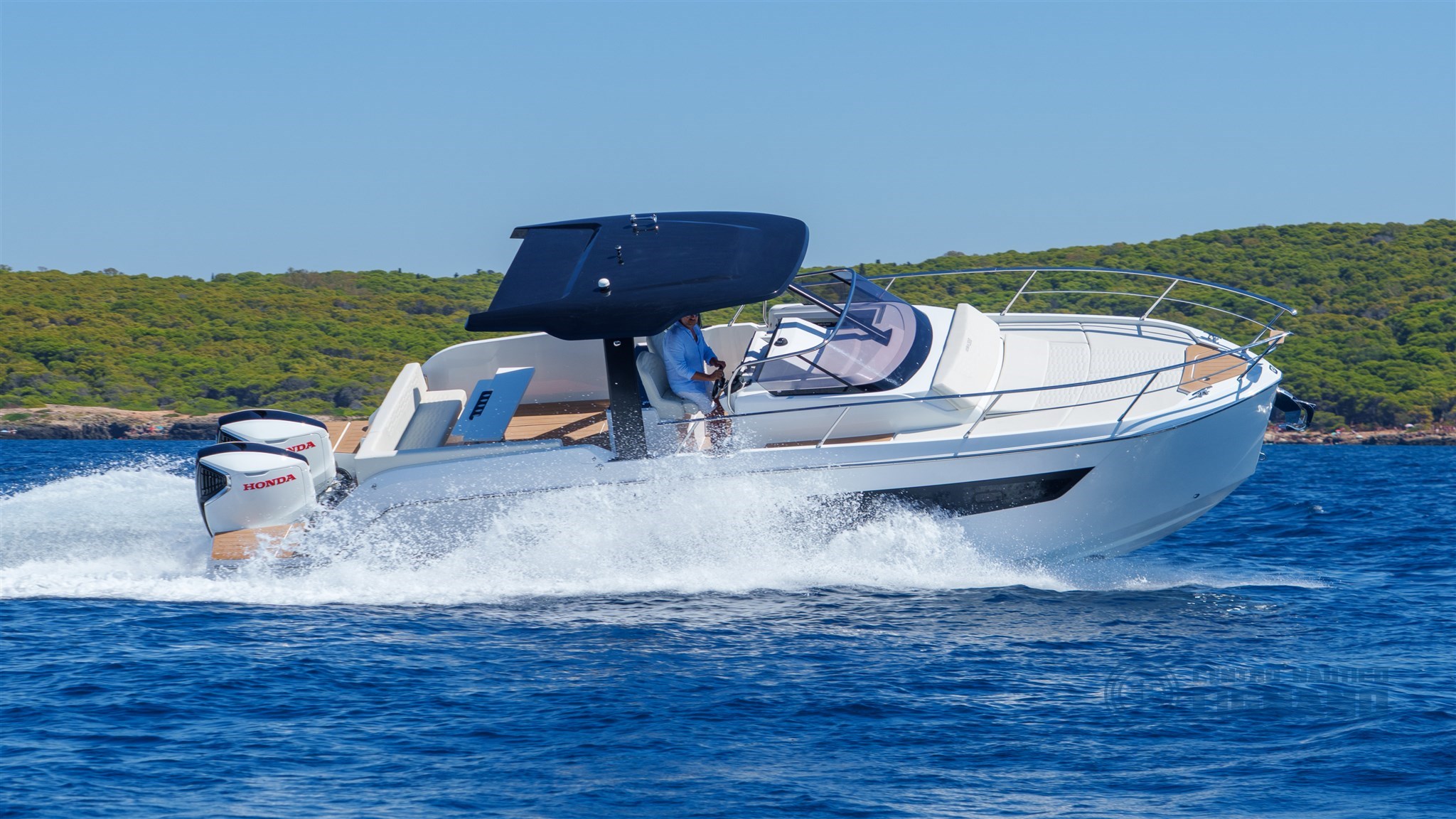 Cuscineria esterna grigia Nimbus Cloud, Carena e coperta colore bianco White, Illuminazione led per navigazione e fonda, Cuscineria interna tinte standard (Copriletto e divani tessuto art. 5450), Pavimenti interni Abet 1679 ciliegio tenue, Cuscini arredo 40 x 40 Art. 5435, Pareti laminato RAL 7030 opaco, Cielini e fianchi tessuto Art. 5430, Luci in cabina di prua e cabina di poppa, Mobile esterno con wetbar e lavello, Bagno separato con luce e mobile con lavello, Box doccia con pannelli di separazione, Impianto pompe di sentina automatiche a prua e a poppa, Mobile in legno in cabina con piano antigraffio e contenitori, Armadio in cabina di poppa, Quadro elettrico in cabina, Pannello utenze con impianto elettrico, Tavolo esterno di poppa con gambe telescopiche, 6 oblò apribili nelle cabine e bagno, Doccia esterna, WC elettrico marino con impianto serbatoio acque nere, Impianto doccia in bagno, Cabina di poppa separata con porta, Bussola incasso retroilluminata, Scaletta a mare in acciaio inox.
